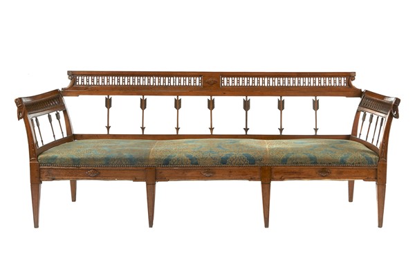 Divano in noce intagliato, schienale a giorno con elementi in forma di freccia. Gambe ad obelisco rovesciato. Rivestito in tessuto da parati atelier di Mariano Fortuny, Venezia, secolo XIX-XX. Decoro stampato a mano con polvere d’oro sparsa su campo disegnato su fondo azzurro e riproducente fiori, melograni, gigli e fiordalisi tipici dell’Impero Ottomano (cm 210) (difetti e restauri)