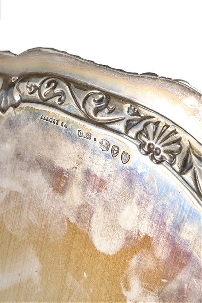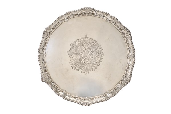 Salver in argento con bordura godronata e a volute fogliacee, piano inciso con stemma araldico. Londra, 1891 (d. cm 36,5) (g 1170) (lievi difetti)