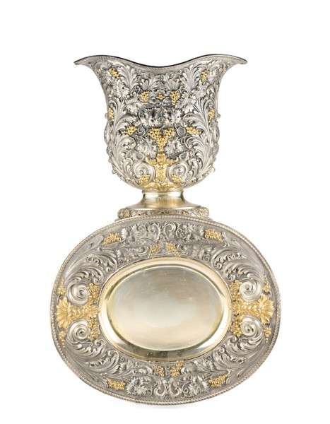 Rinfrescatoio con vassoio in argento riccamente decorato in rilievo a volute fogliate e grappoli d'uva con dettagli dorati. Vassoio ovale di forma mossa con bordo cordonato. Milano, argentiere Fiorentini Guido (h. cm 33, vassoio cm 43x36) (g 3200) (difetti)