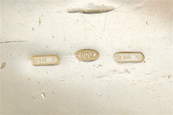 A silver refreshment with tray. Milan, silversmith Fiorentini Guido (h. cm 33, tray cm 43x36) (g 3200) (defects)