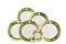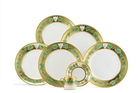 Manifattura di Parigi, 1820 circa. Cinque piatti ed una tazzina con piattino in porcellana decorata nella tesa a tralcio d'edera e bacche in verde su fondo oro, bordure centrate da scudo con monogramma CC in oro (piatto d. cm 24; tazzina h. cm 6; piattino d. cm 13) (difetti)
