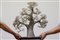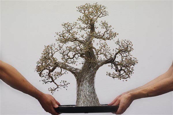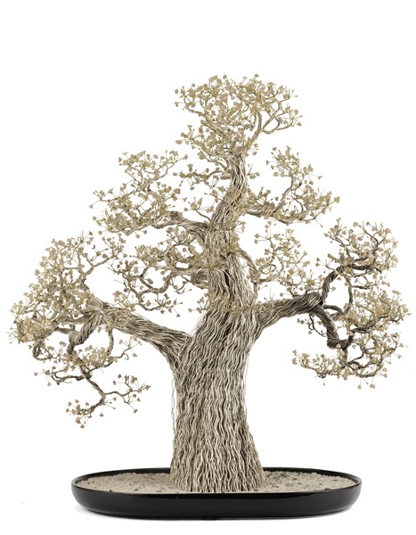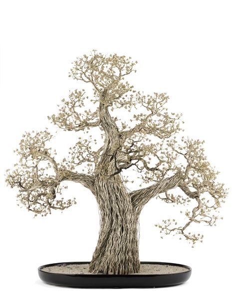 Bonsai a fili d'argento intrecciati con fiorellini in tessuto, su base in ceram