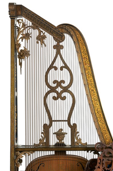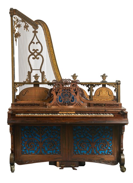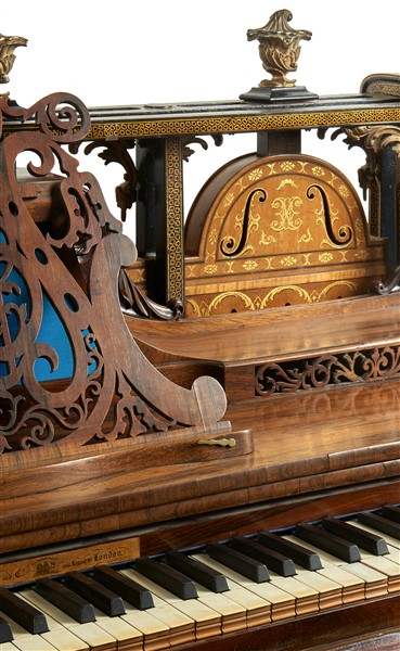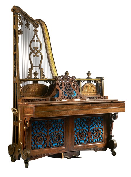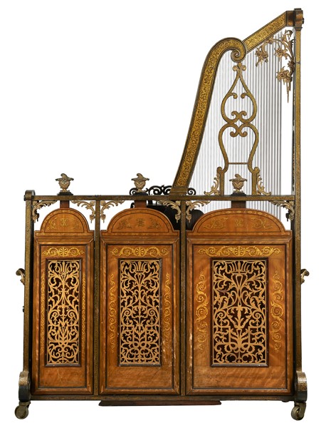 Pianoforte a coda verticale modello Euphonicon. Struttura in ghisa e legno con tre casse armoniche finemente decorate. Tastiera con placcatura dei diatonici in avorio e frontalini in legno. La coda si sviluppa verticalmente con le corde a vista in foggia di arpa. L’ "arpa" in ghisa è finemente decorata e guarnita da elementi in bronzo dorato.