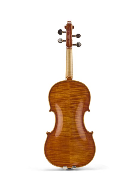 Model Giuseppe Guarneri of the Jesus 1743 "Cannon", bottom in two pieces with a half-width marquetry, rising from the joint, brown orange paint, label «S. ALESSIO" / Stefano Conia/ Made in Cremona/ Year 2016. / S. Conia» and internal focus stamp «S. Conia», in perfect condition (bottom length mm 357). In a satin bag embroidered by Stefano Conia