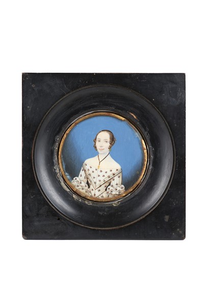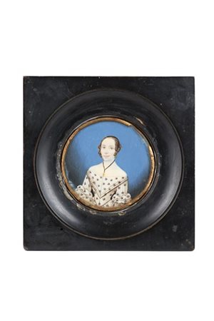 Maestro del secolo XIX. "Ritratto di dama con abito decorato a fiori" miniatura tonda su avorio (d. cm 7) In cornice (difetti)
