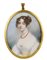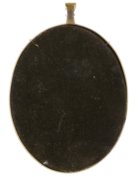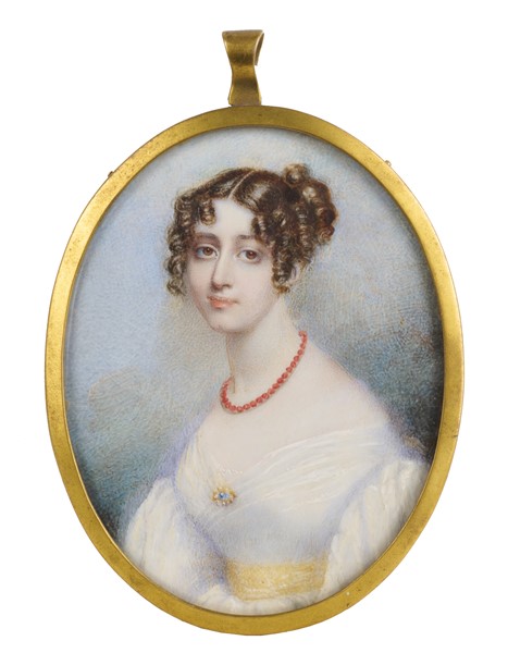 Maestro del secolo XIX. "Ritratto di dama in abito bianco e collana di corallo" miniatura ovale su avorio (cm 9x7) In cornice