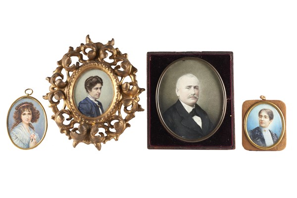 Giuseppe Grassis, M.Cuoighi e anonimo, secoli XIX-XX. Lotto composto da quattro miniature su avorio di diverse misure. In cornici (difetti)