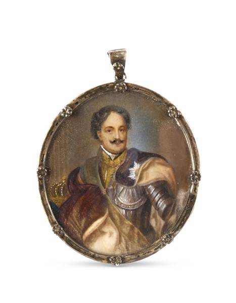School of the 19th century. Portrait of ruler, miniature in ivory (cm 6x5) in a pendant frame (slight defects)
