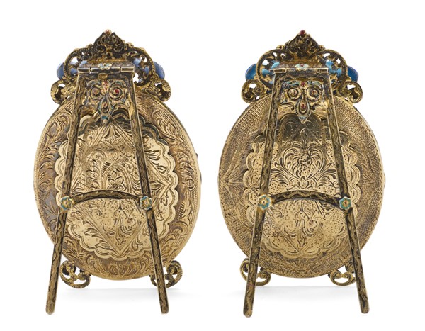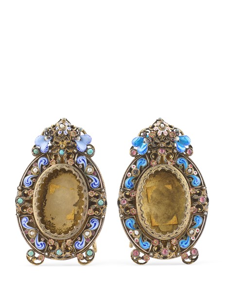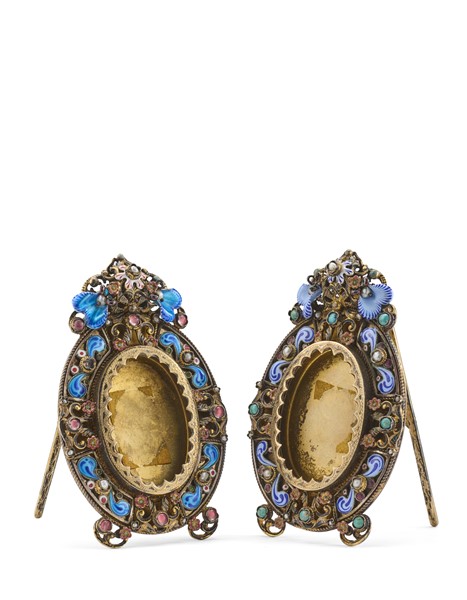 Lot 993 | Coppia di piccole cornici portafoto ovali in argento dorato smaltate in policro