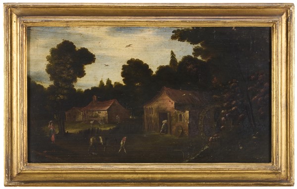 Scuola del nord Europa della fine del secolo XVIII "Paesaggio con figure" olio