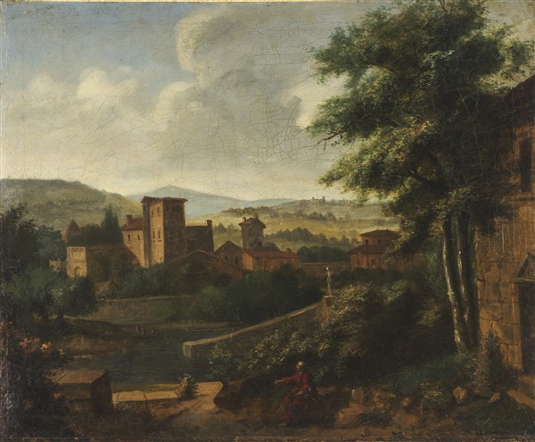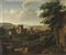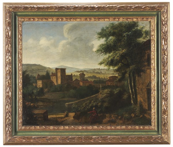 Scuola romana del secolo XVIII "Paesaggio con figure" olio su tela (cm 38x46)