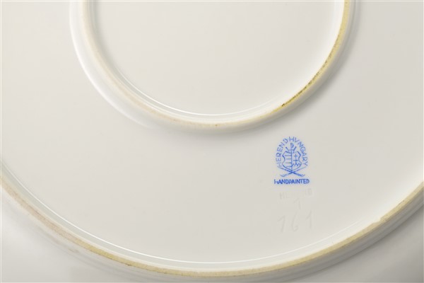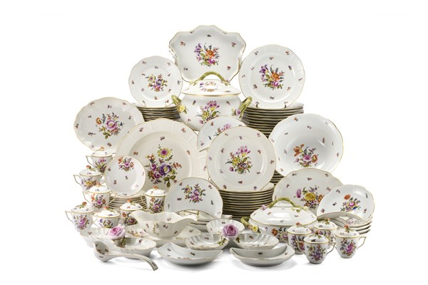 Manifattura di Herend, modello "Bouquet de Herend". Servizio da tavola in porcellana decorata in policromia a mazzetti floreali e sparsi con profili in oro, composto da: trentasei piatti piani, tredici fondine, tredici piatti da frutta, una zuppiera biansata con coperchio e presentoir, una legumiera biansata con coperchio, una salsiera bivalve biansata con mestolino, dodici piattini a mezzaluna, due piatti ovali, due antipastiere a valva di conchiglia, un'insalatiera e undici cremiere con coperchio e dodici piattini (lievi difetti)