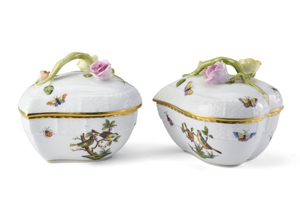 Manifattura di Herend, secolo XX. Coppia di zuccheriere in porcellana modellate in forma di cuore, decorate da fiori, volatili ed insetti policromi, profili dorati, prese a forma di rami fioriti a rilievo. Marcate sotto la base (cm 10x8,5) (difetti)