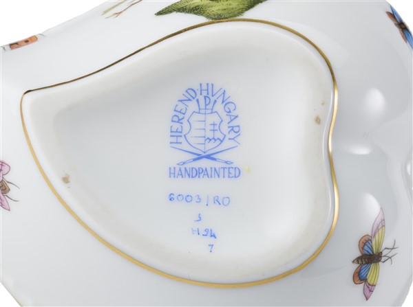 Herend’s manufacture, 20th century. Pair of porcelain sugar bowls heart shaped. Marked under the base (10x8,5 cm) (defects)