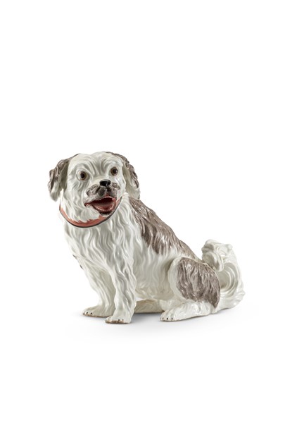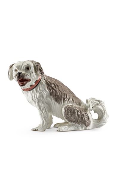Manifattura francese, secolo XIX. Figura di cane in porcellana dipinta in polic