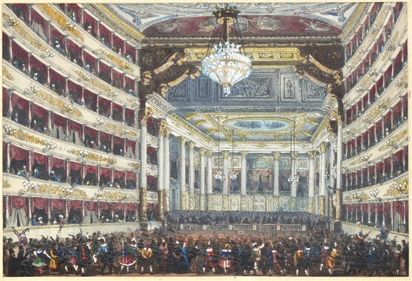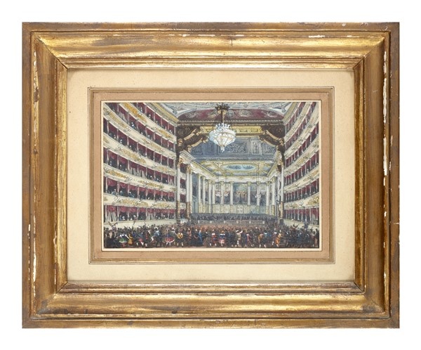 Cassani "L'interno della Scala di Milano" litografia con ricca coloritura (mm 16
