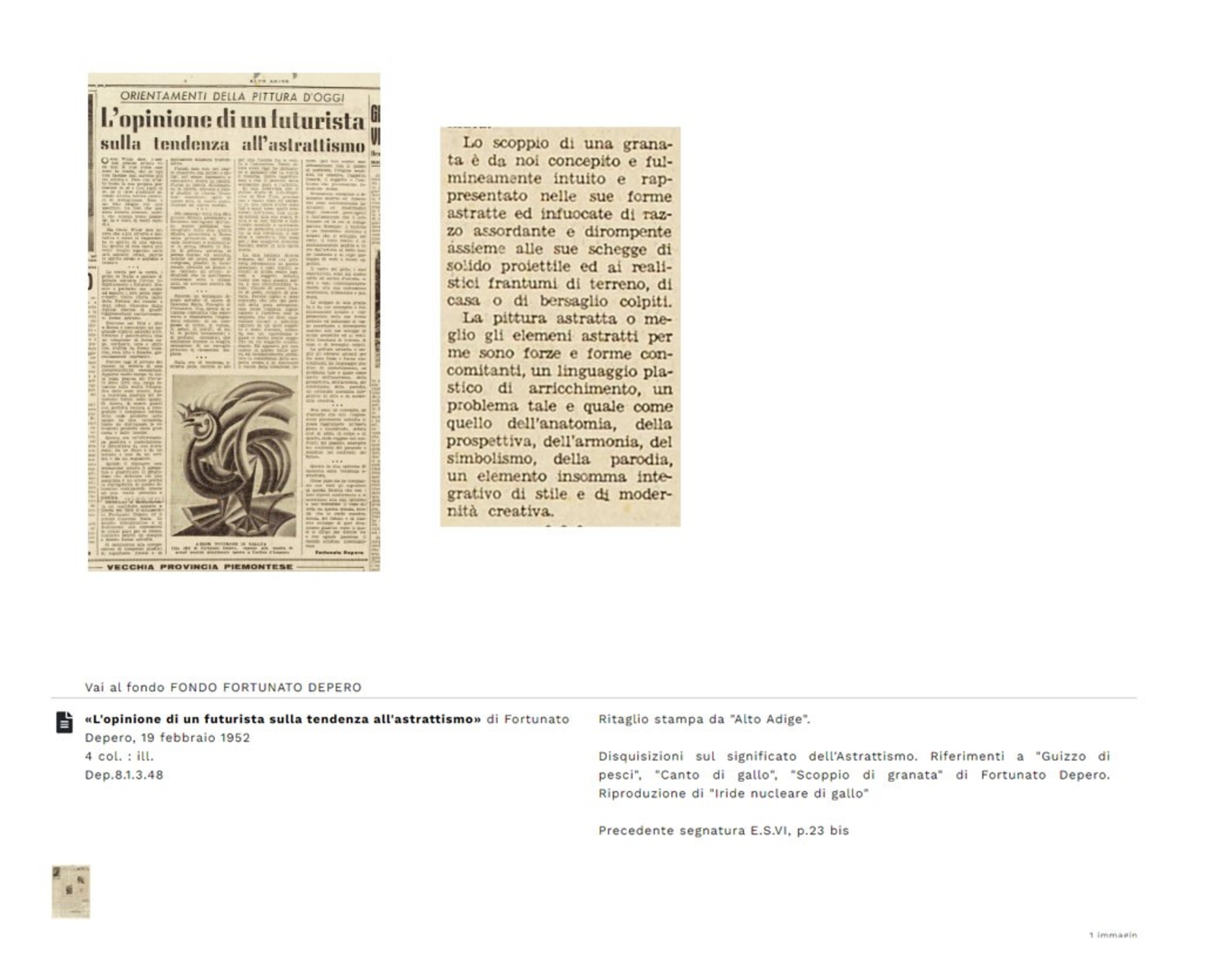 F. Depero "L'opinione di un futurista sulla tendenza all'astrattismo" in "Alto Adige", 19 febbraio 1952, cit.