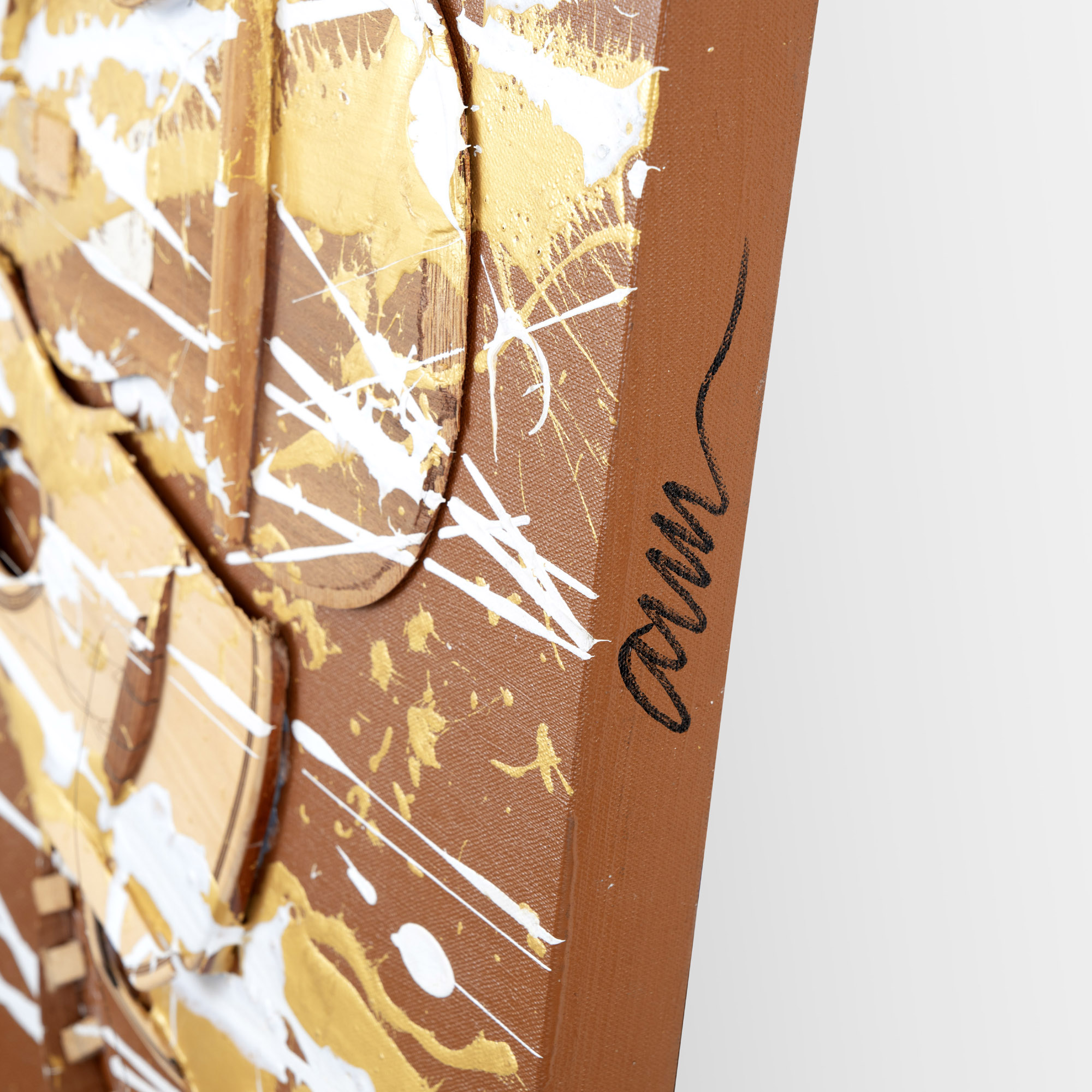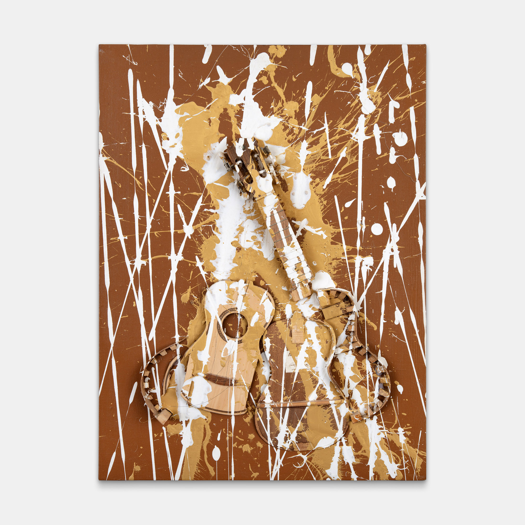 Ukulele tagliato e gettata di colori acrilici su tela riportata su tavola