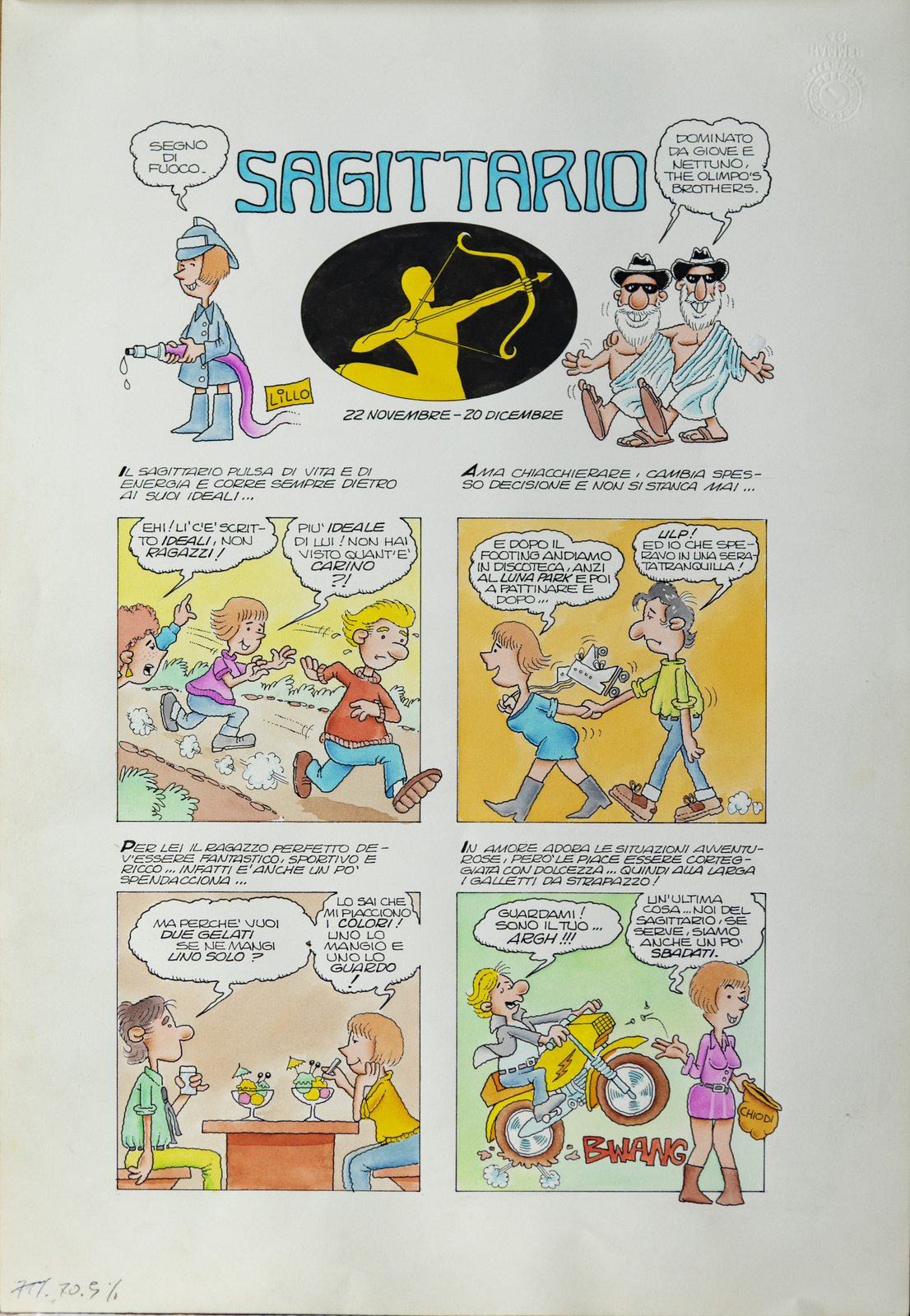 LILLO La serie dei segni zodiacali. 1999. Chine colorate su Cartoncino Schoeller. Cm 36,00 x 25,00. Tavola sul segno zodiacale del Sagittario con velina trasparente di protezione.