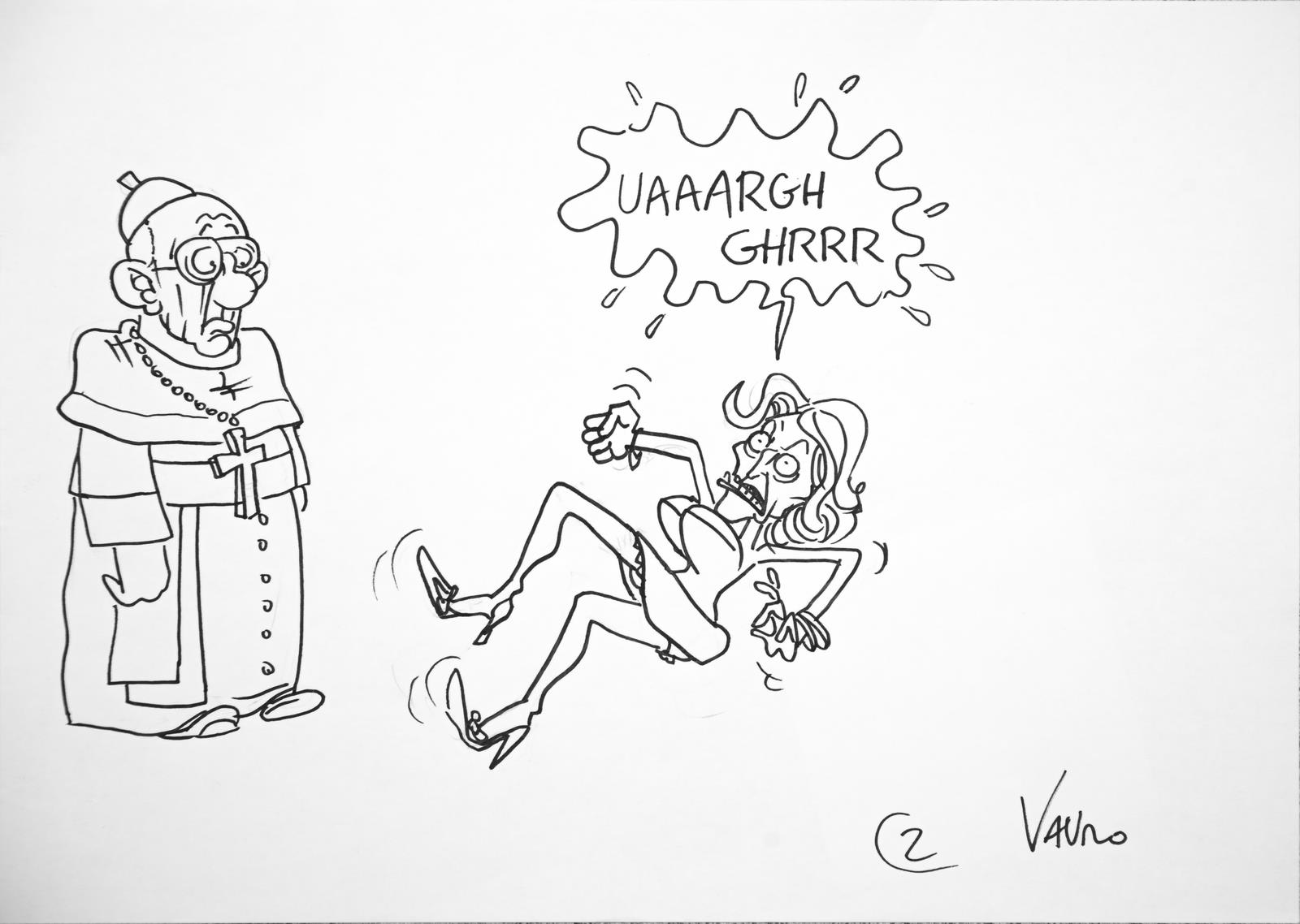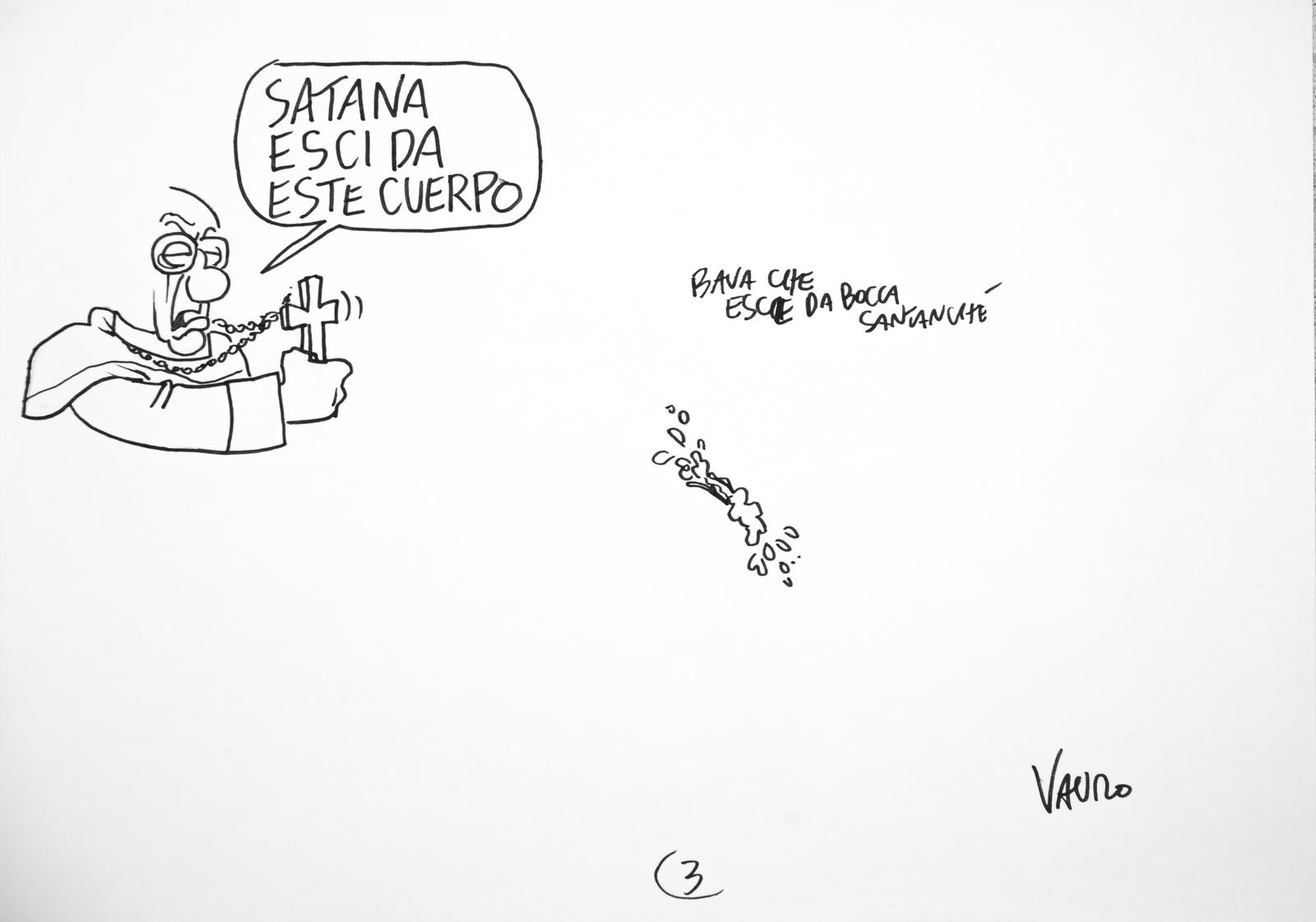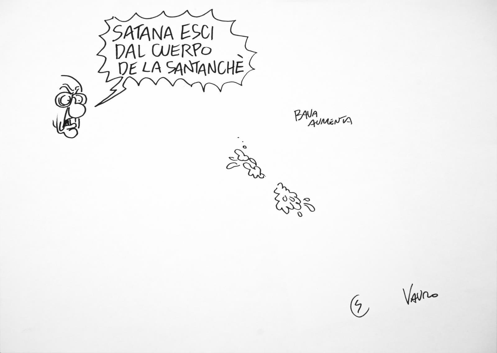 SENESI VAURO (n. 1955) "IL PAPA ESORCISTA"(ANIMAZIONE INTEGRALE PER SERVIZIO PUBBLICO IL PROGRAMMA DI MICHELE SANTORO). 2013. pennarello su carta. Cm 30,00 x 20,00. https://michelesantoro.it/2013/05/santanche-esci-corpo-la-vignetta-vauro/