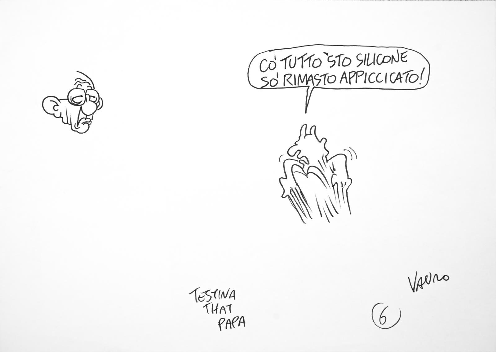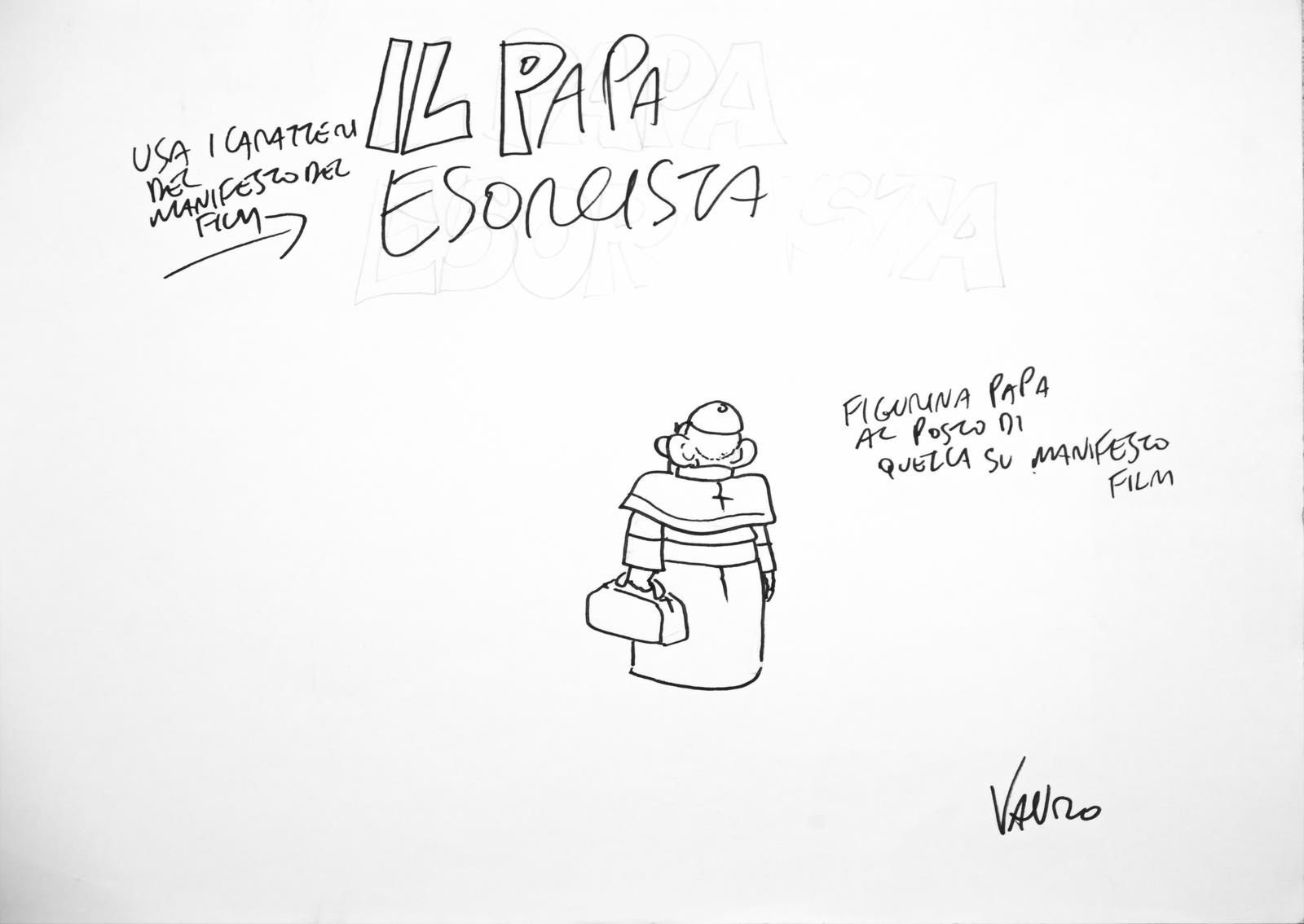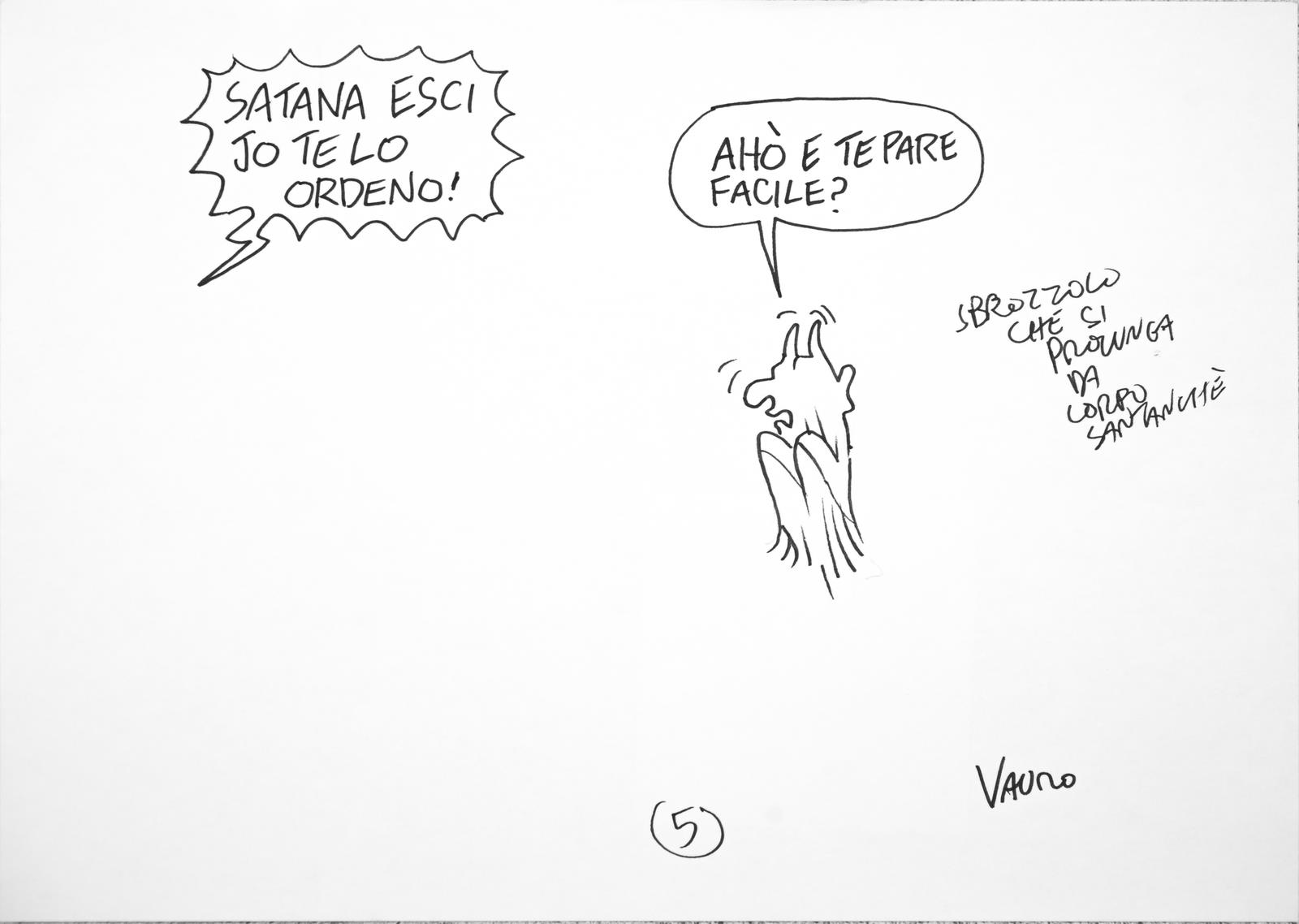SENESI VAURO (n. 1955) "IL PAPA ESORCISTA"(ANIMAZIONE INTEGRALE PER SERVIZIO PUBBLICO IL PROGRAMMA DI MICHELE SANTORO). 2013. pennarello su carta. Cm 30,00 x 20,00. https://michelesantoro.it/2013/05/santanche-esci-corpo-la-vignetta-vauro/