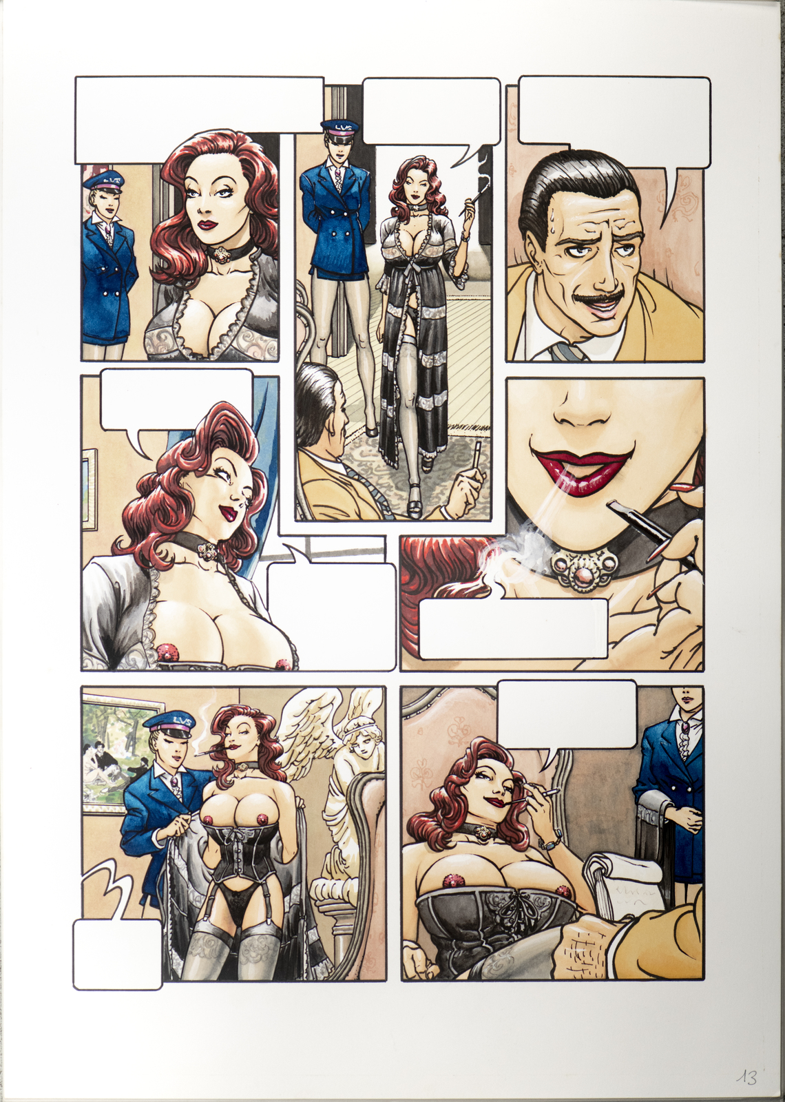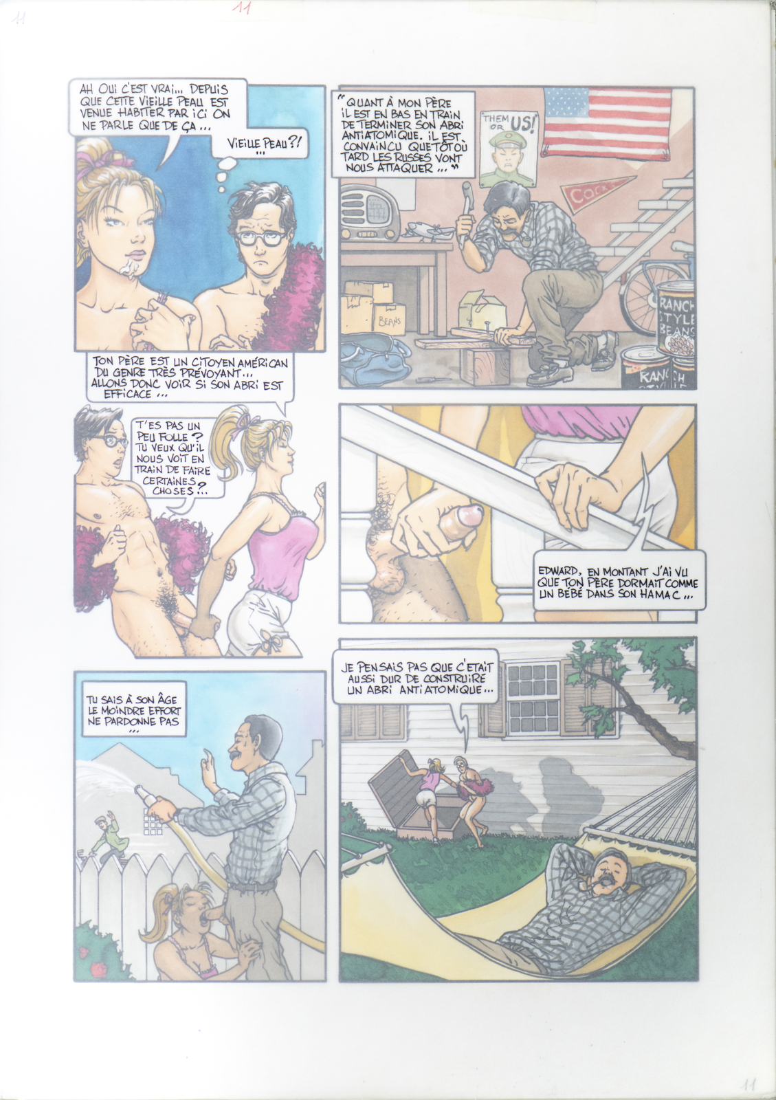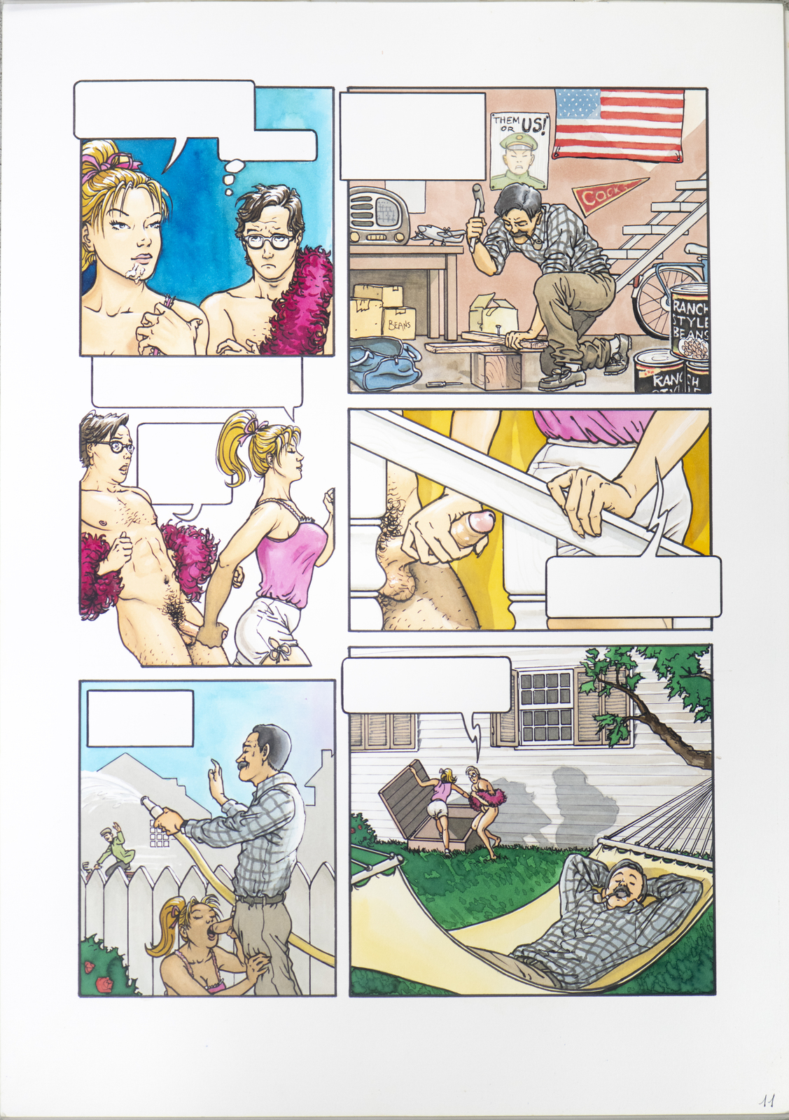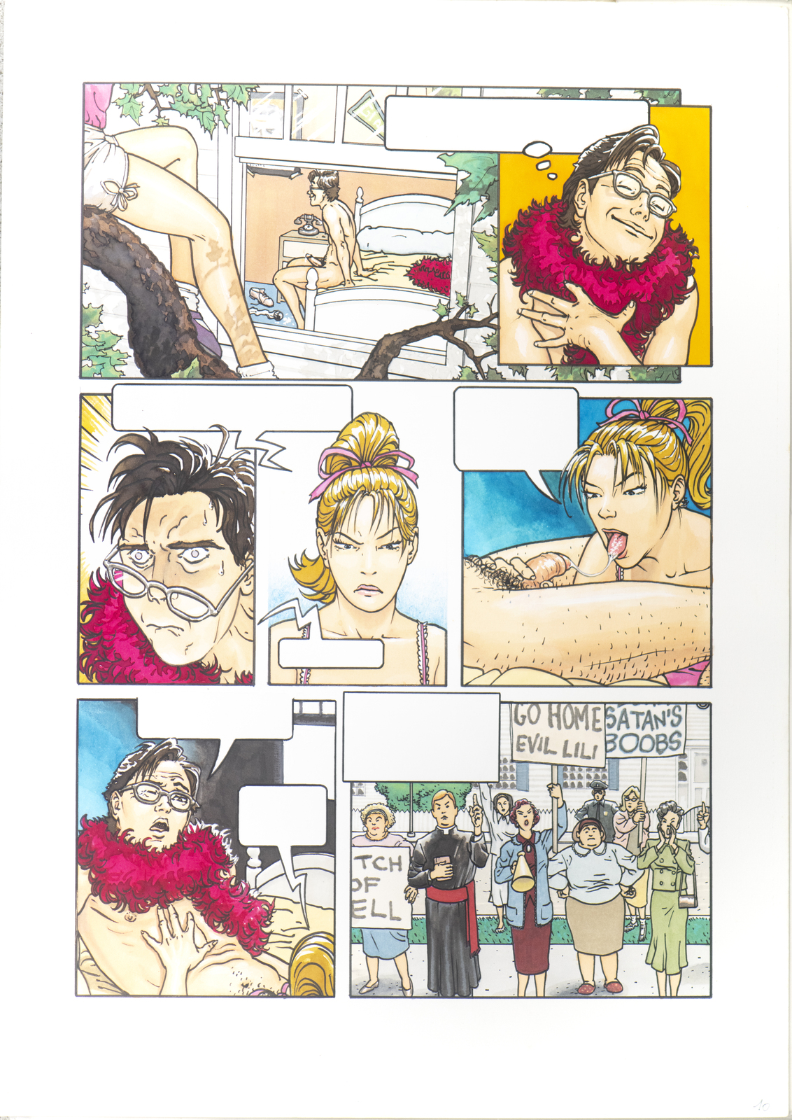 Vitus e Fildor "SEX ATTACK EPISODIO N 2". 2009. china, ecoline, pantone su carta. Cm 28,00 x 40,00. Straordinaria graphic fantasy novel erotica, qui presente nell'edizione con il lettering in francese, divisa in cinque episodi. Una storia nella quale Russ Meyer incontra Ed Wood ma sotto forma di fumetto e tavola disegnata. Dalla piccola cittadina di Hyperville, con l'arrivo di un gruppo di marziani, succedono cose che voi umani....Un omaggio lussurioso ai vecchi film di serie B degli anni '60 sotto forma di una fantascienza di serie B in cui una folla di personaggi attraversa ed anima queste incredibili tavole: alieni malvagi, motocicliste, travestiti, naziste meretrici. Bastano i due protagonisti a dircela lunga: Jessie Lou Lovercraft e il suo nerd fidanzato con il pallino della lingerie intima. I due però non si sono accorti che gli alieni hanno attaccato la terra con un raggio di piacere...e allora tutto si trasforma, cambia colore, forma e comportamento. La straordinaria colorazione echeggia poi gli albi della DoFantasy con certi lavori di Templeton, Zero Galvan, Slasher, Pyat, Wayne Wyne...