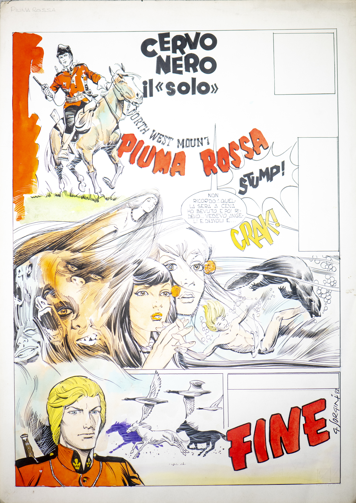 Sorgini Gino "Piuma Rossa". 1982. china e acquarello su cartoncino. Cm 50,00 x 35,00. Sul settimanale cattolico Il Giornalino esordisce nel 1977 il personaggio di Piuma Rossa, una giovane giubba rossa canadese creata da Mario Basari e Luigi Sorgini. Figlio di un bianco e di un’indiana e rimasto orfano, l’eroe della serie aveva come padri adottivi un sergente della Polizia a cavallo e un sakem dei Piedi Neri, che lo avevano allevato. Meglio di altri, poteva quindi proporsi come un ideale tramite tra i due popoli. 1 tavola su carta