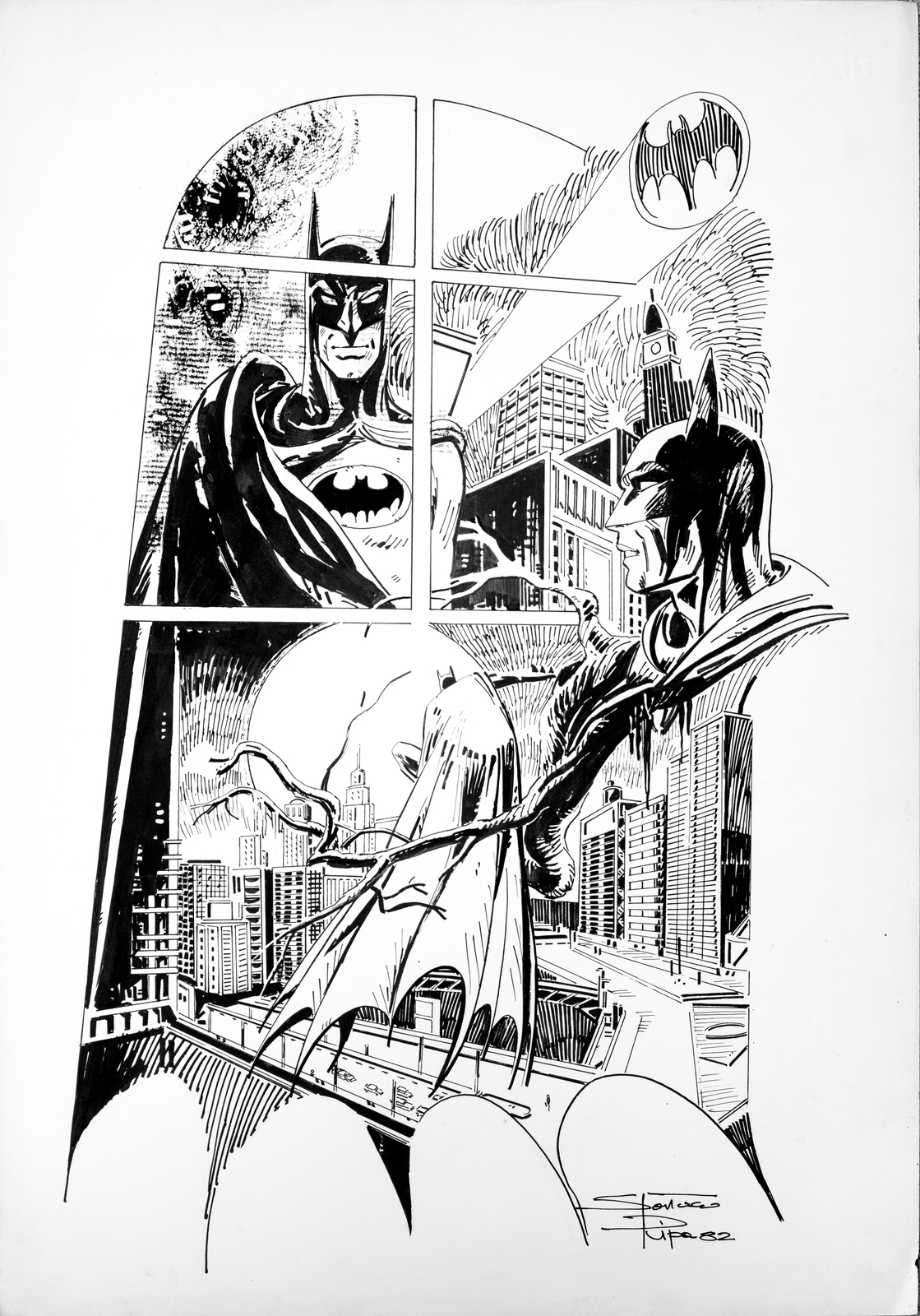 Ripa Spartaco Studio per Batman. 1982. China su cartoncino. Cm 50,00 x 35,00. Inizia con Lanciostory e Skorpio. Dal 1994 intraprende una collaborazione con Il giornalino e per varie storie illustrate per Feltrinelli anche su testi di Stefano Benni