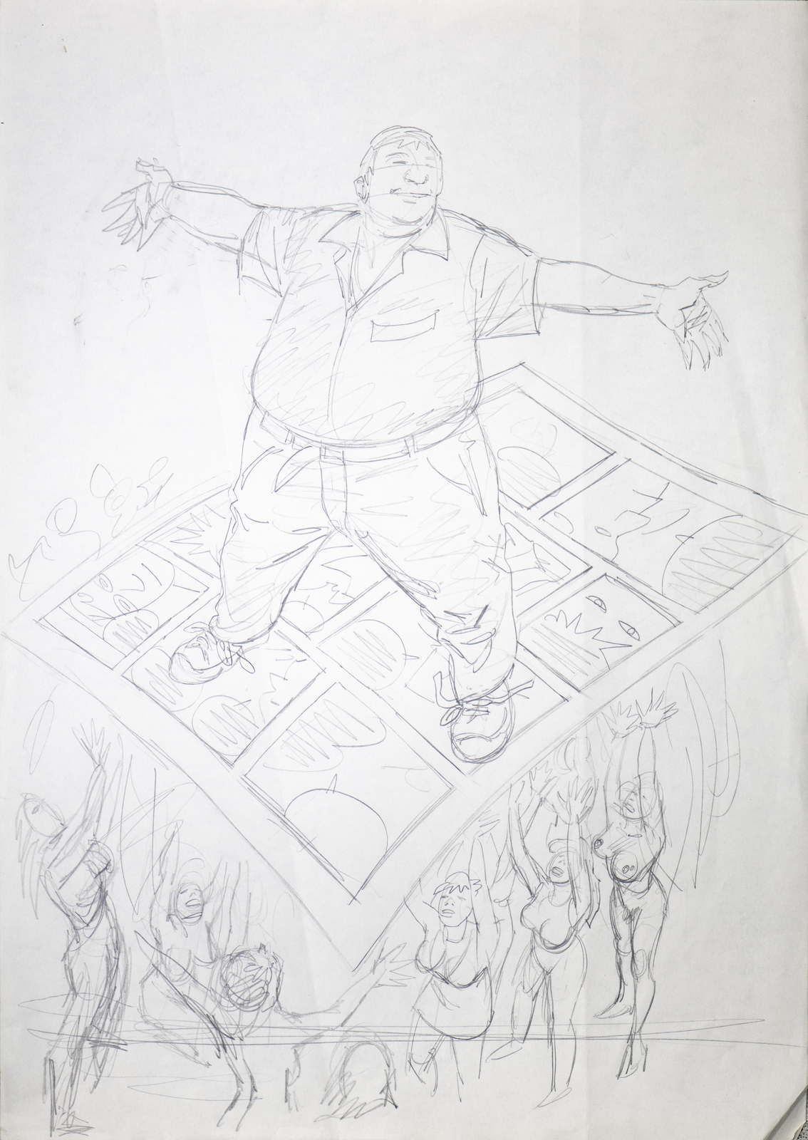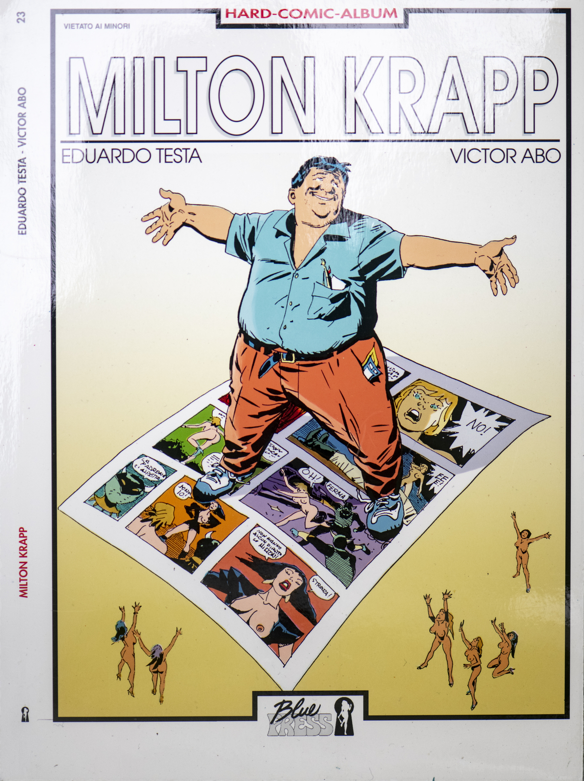 Trigo Gustavo "Milton Krapp". 1990. grafite su carta. Cm 42,00 x 30,00. Un disegno di copertina non firmato per Hard Comic Album Blue Press di cui si allega però anche cartone lucido di copertina con i titoli di testa da cui si traduce l'autenticità.