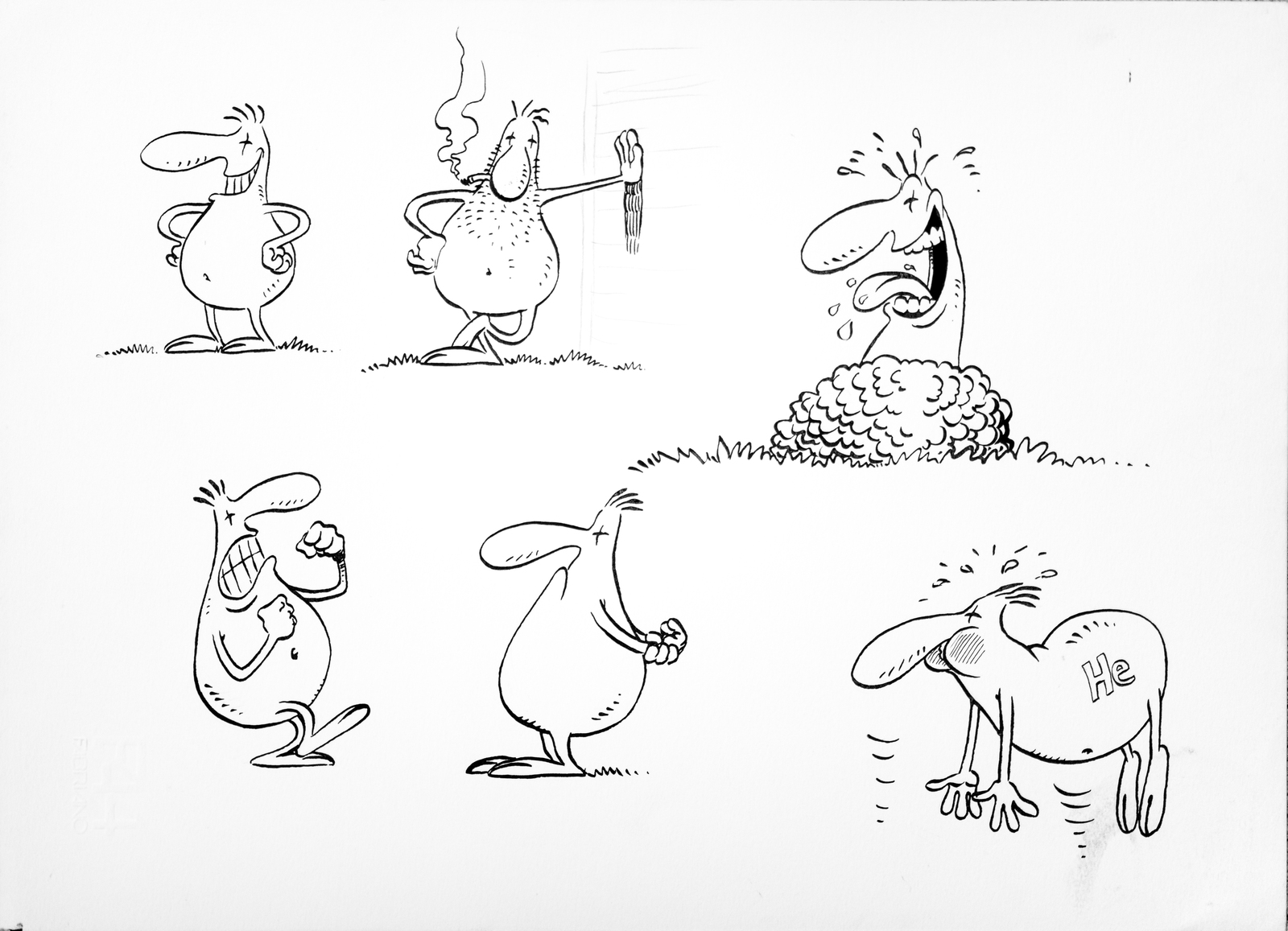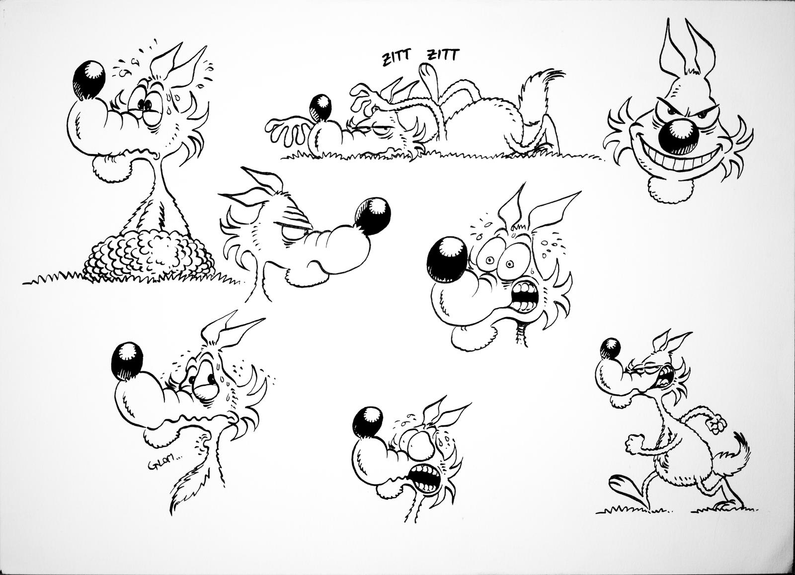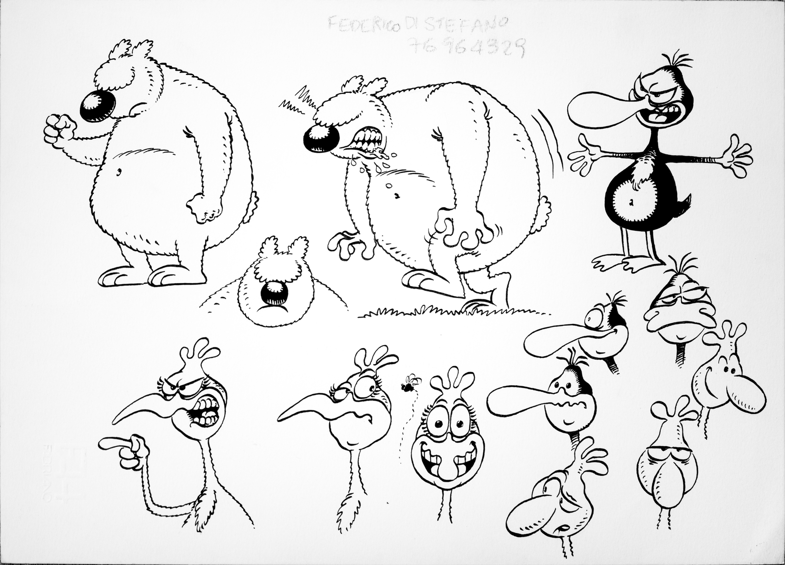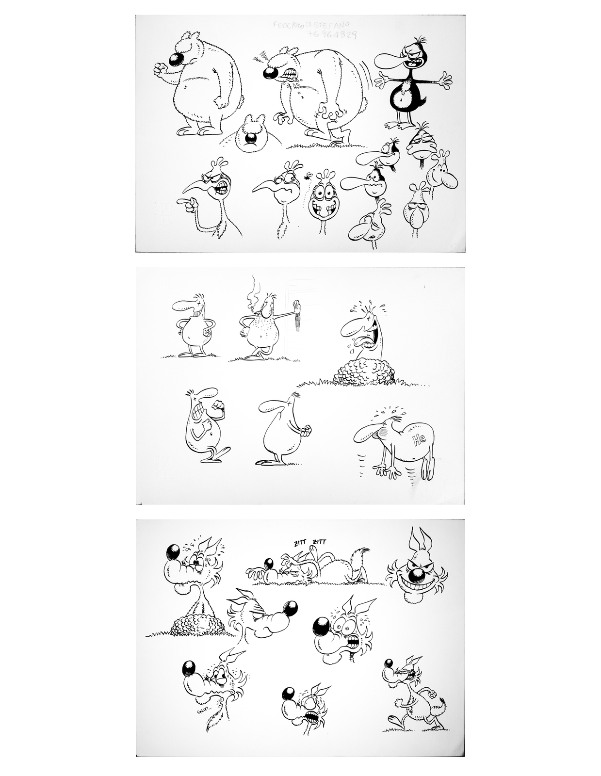 Di Stefano Federico Lupo Alberto. China su cartoncino. Cm 24,00 x 33,00. Serie di tre tavole umoristiche su vari personaggi della saga di Lupo Alberto. Si nota appuntato a matita il nome di Federico distefano già attivo alla Zero Presso, meglio conosciuta anche come Big Comics, specializzata in parodie