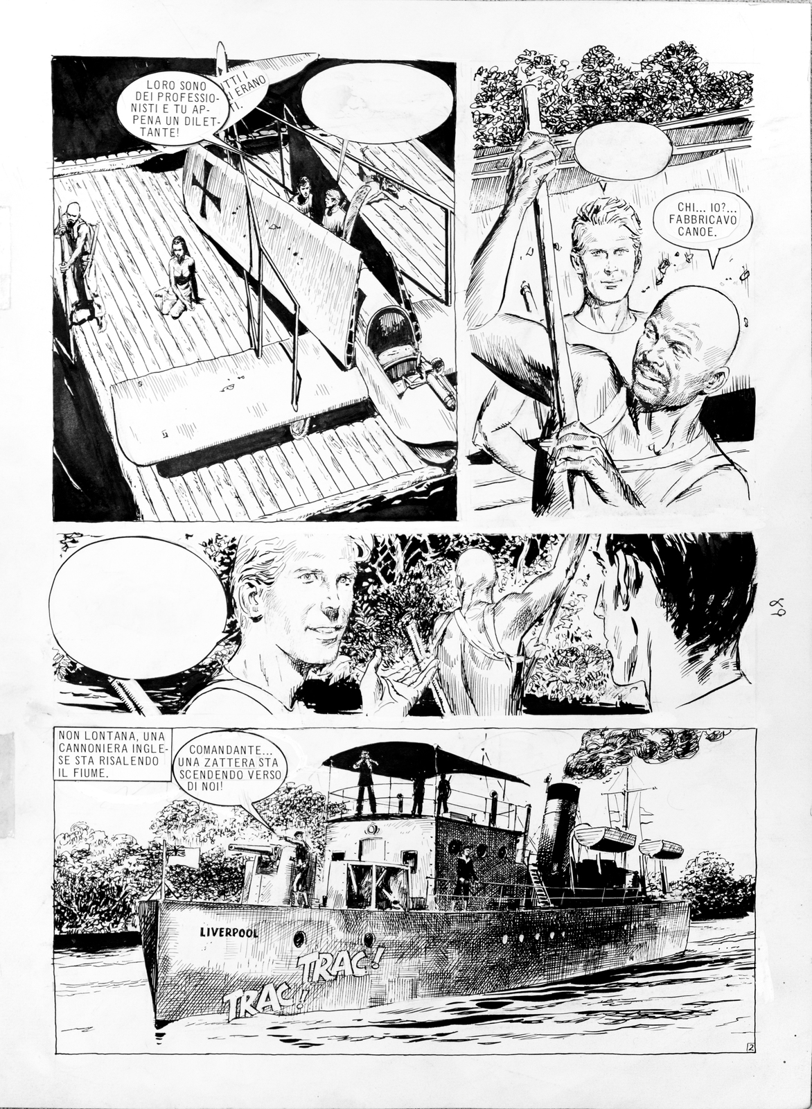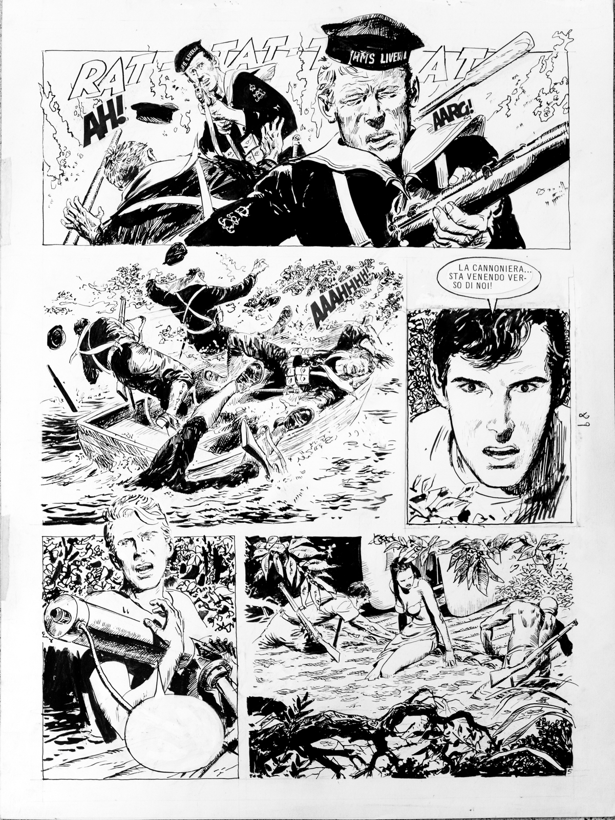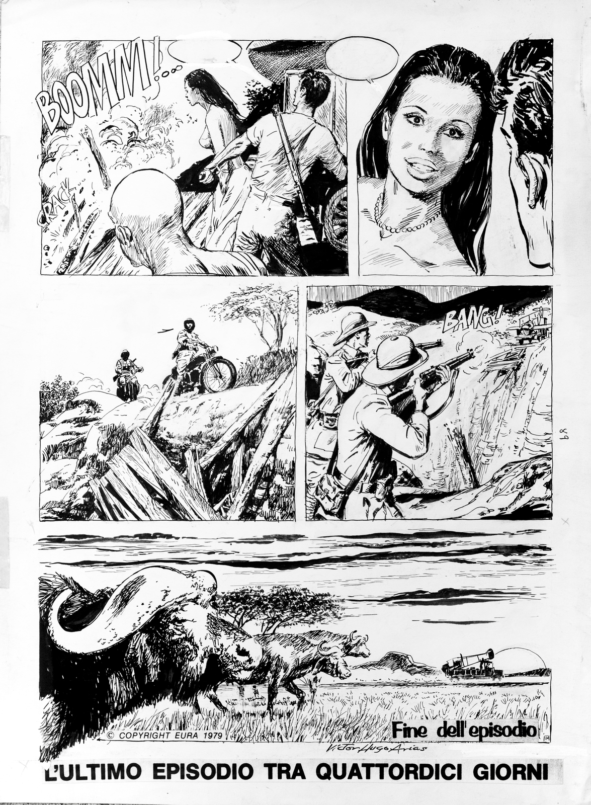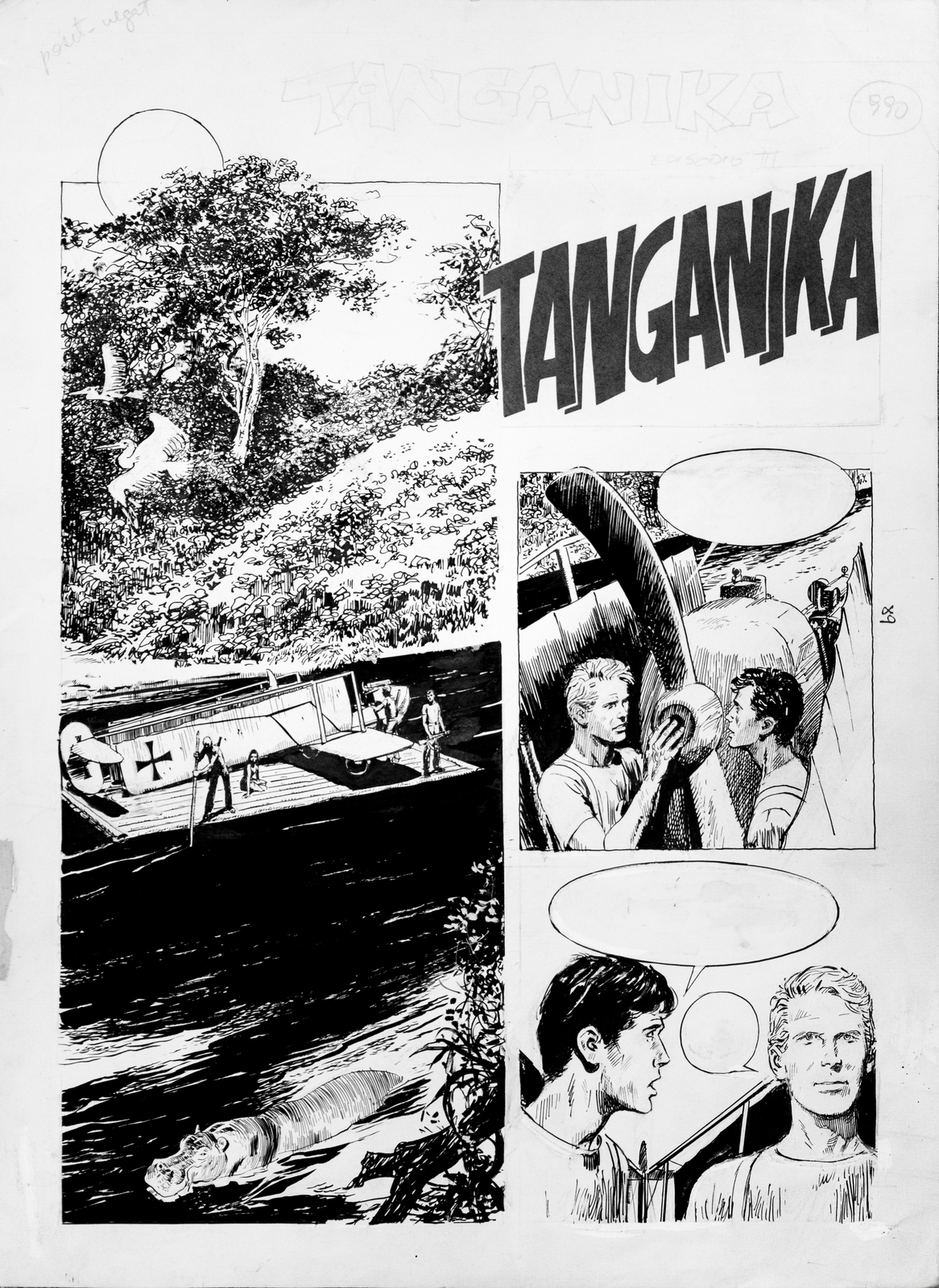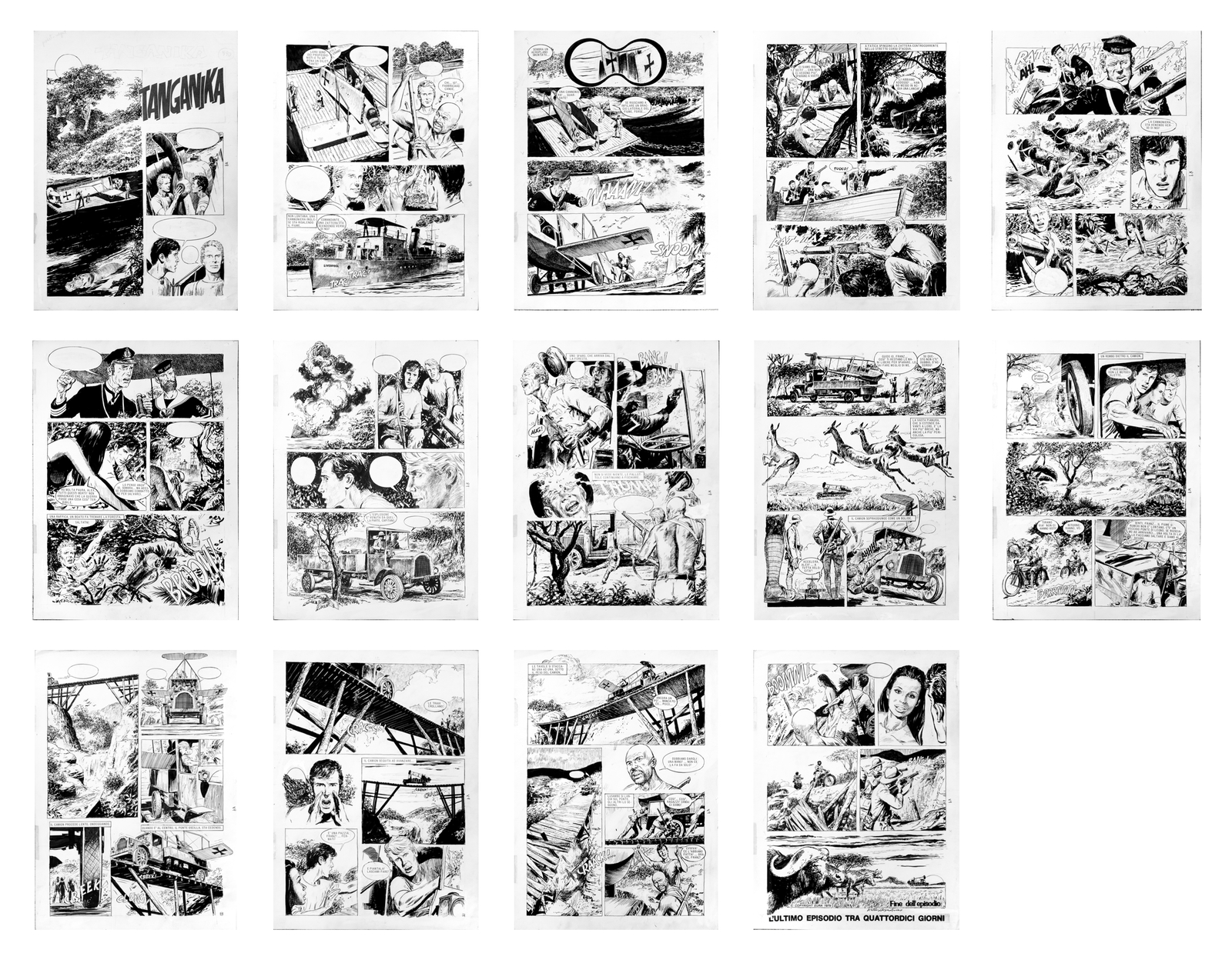 H Arias Victor "Tanganika" - Capitolo 3. 1979. Interventi di china, bianchetto su carta, rimaneggiamenti e montaggi. Cm 38,50 x 28,50. Capitolo 3 integrale della serie Tanganika. 14 tavole su carta, mancanze nel lettering