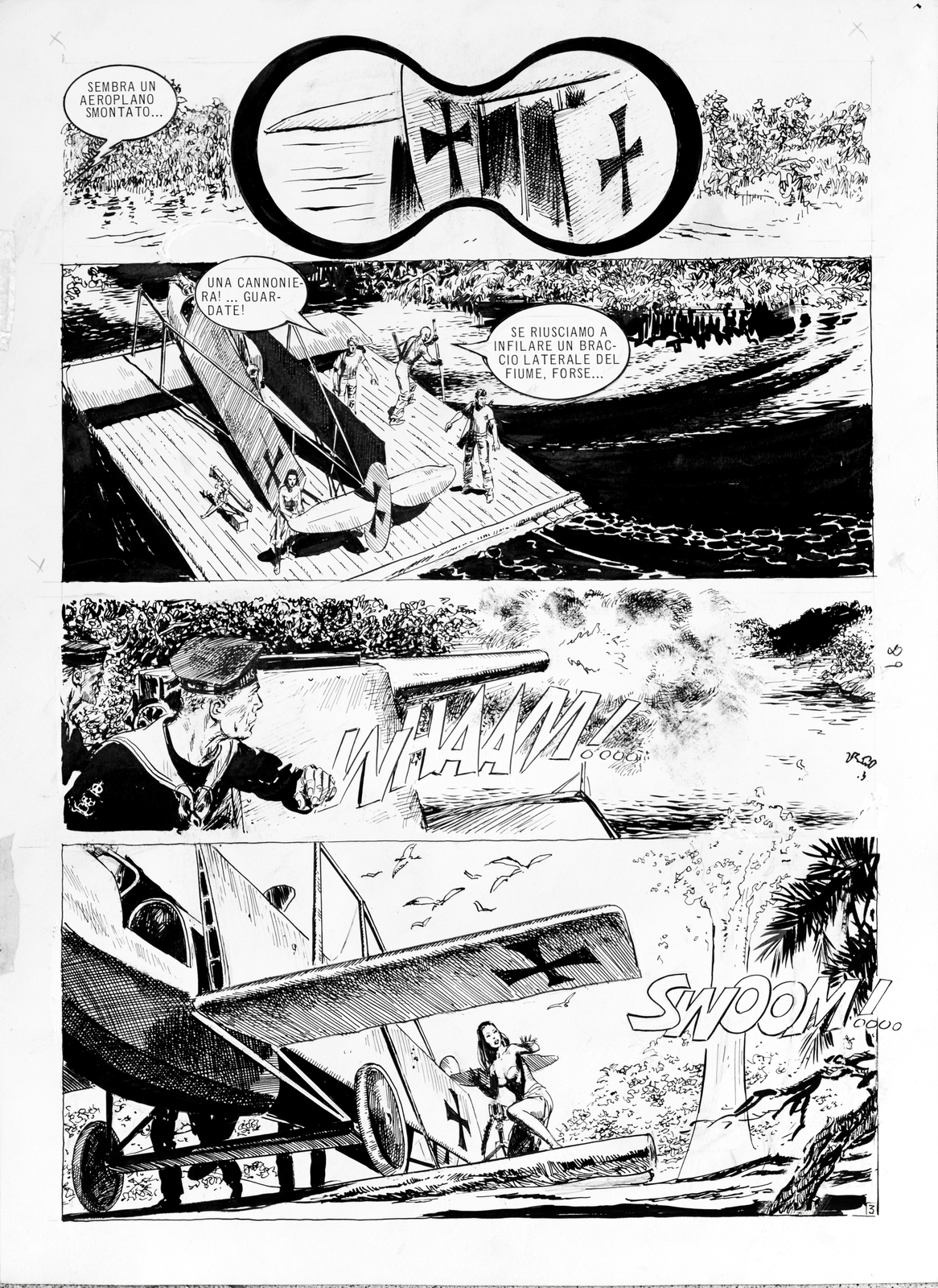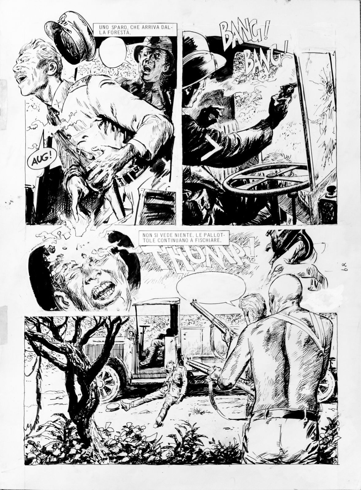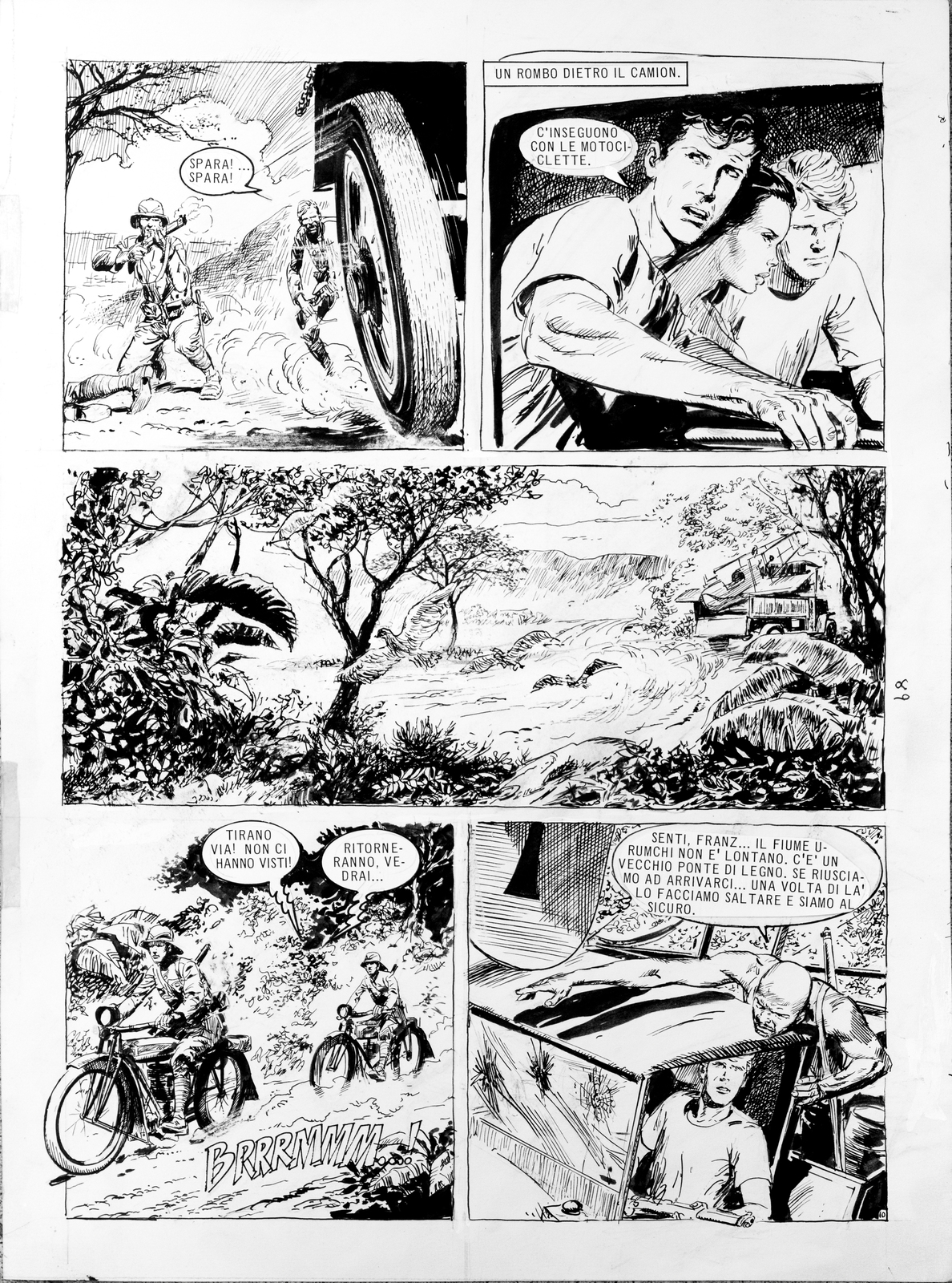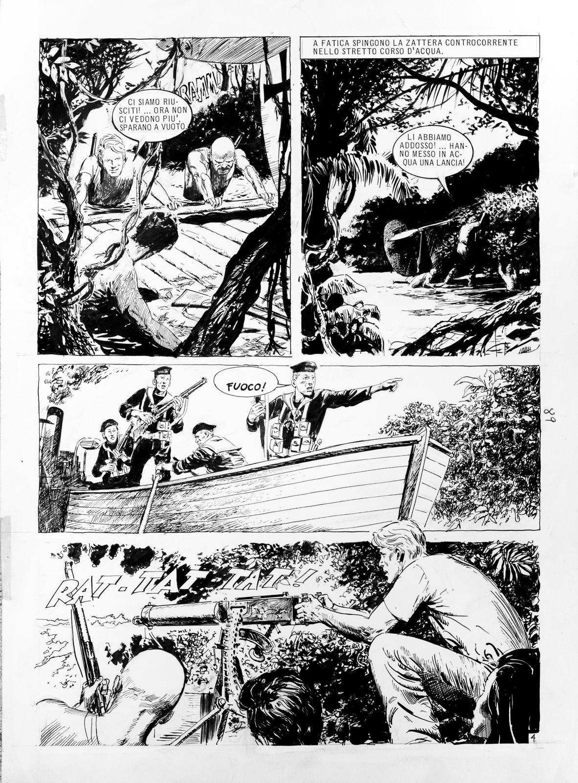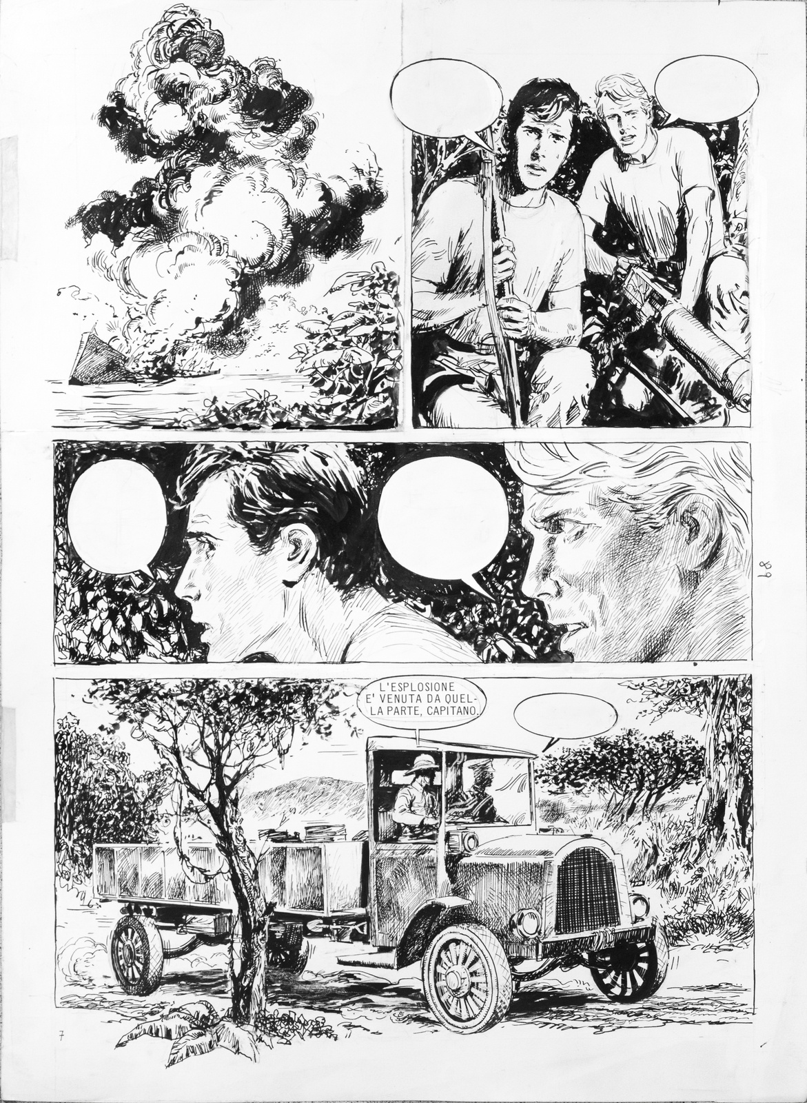 H Arias Victor "Tanganika" - Capitolo 3. 1979. Interventi di china, bianchetto su carta, rimaneggiamenti e montaggi. Cm 38,50 x 28,50. Capitolo 3 integrale della serie Tanganika. 14 tavole su carta, mancanze nel lettering