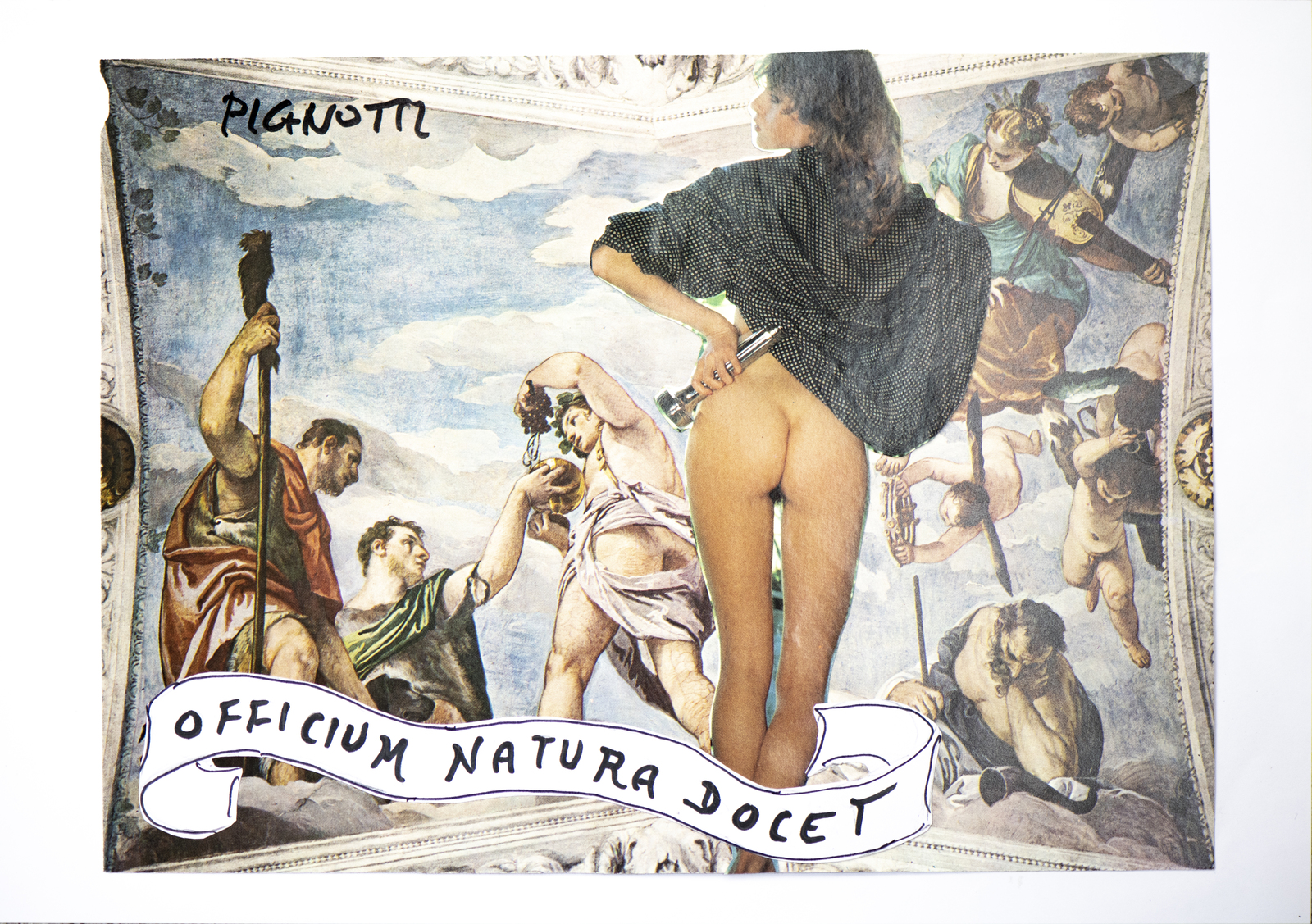 PIGNOTTI LAMBERTO (n. 1926) Cartiglio erotico "Officium natura". pennarelli, grafite e collage su carta. Cm 25,00 x 22,00. "Scorrete le opere erotiche di Pignotti e troverete materiali tratti da immagini dei Fratelli Fabbri, riproduzioni di bassa lega, a scarsa definizione. L’intento del Maestro quello di far parlare le immagini visive attraverso forme di figurazione che erano cartigli un tempo su cui si scriveva, oggi chiamati anche fumetti" dal Millelire di Jonathan Giustini per Lamberto Pignotti "Viaggio in Transiberiana per sconfiggere la noia".