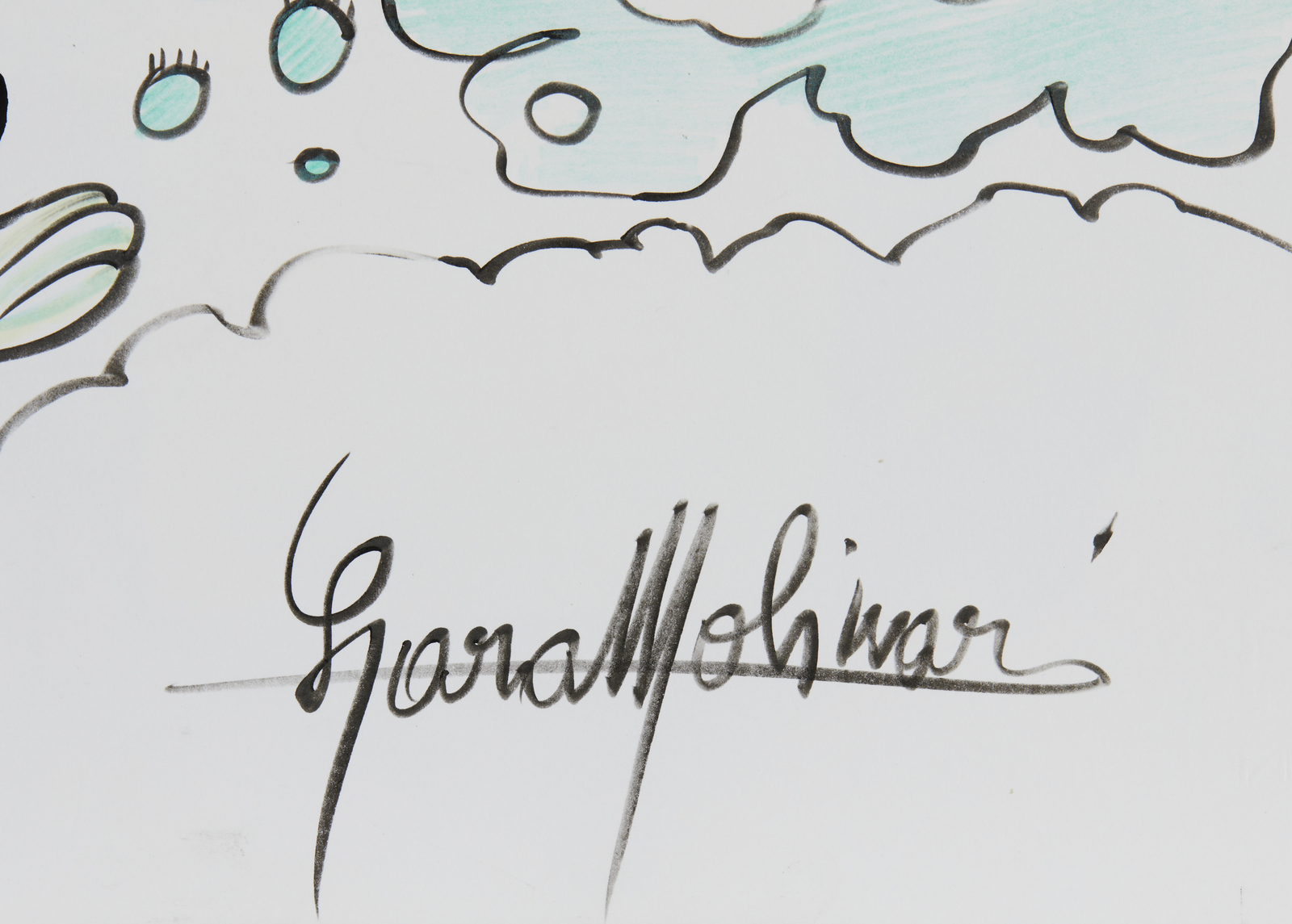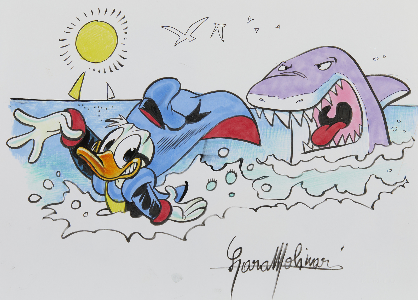 MOLINARI LARA (n. 1970) “Paperinik e lo squalo”. pennarelli su carta. Cm 33,00 x 24,00. firma in basso a destra