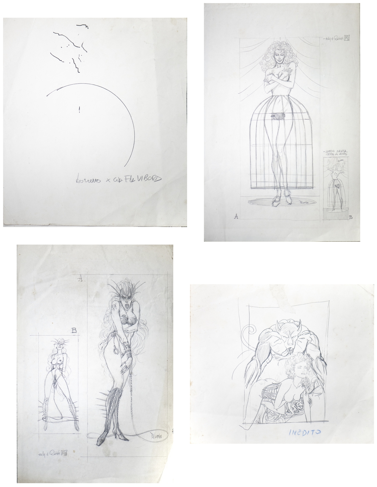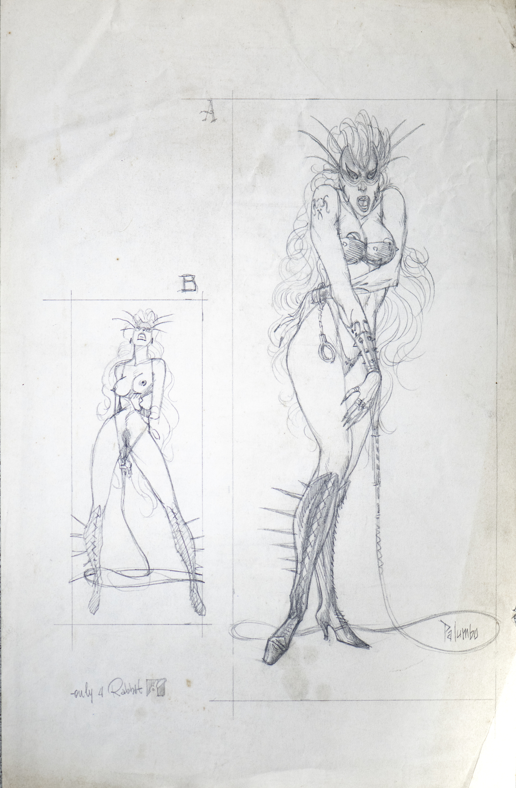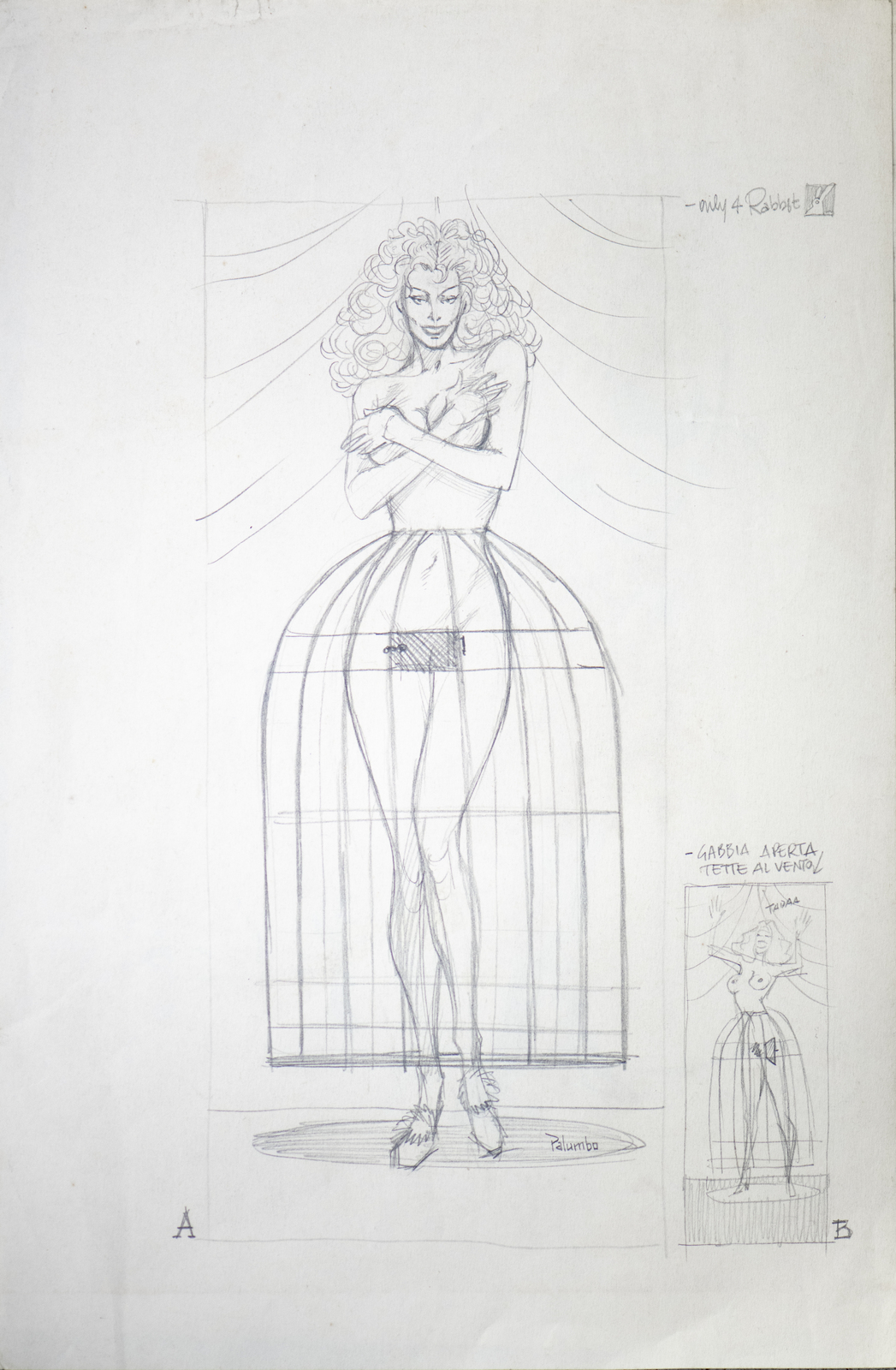 Palumbo Giuseppe "STUDI PER JESSICA RABBIT". grafite su carta. Cm 21,00 x 33,00. Dall'autore storico per Diabolik e Martin Mystere e prima ancora per Frigidaire alcuni studi su Jessica Rabbit. Sul retro di un foglio si nota un altro disegno che riproduciamo.