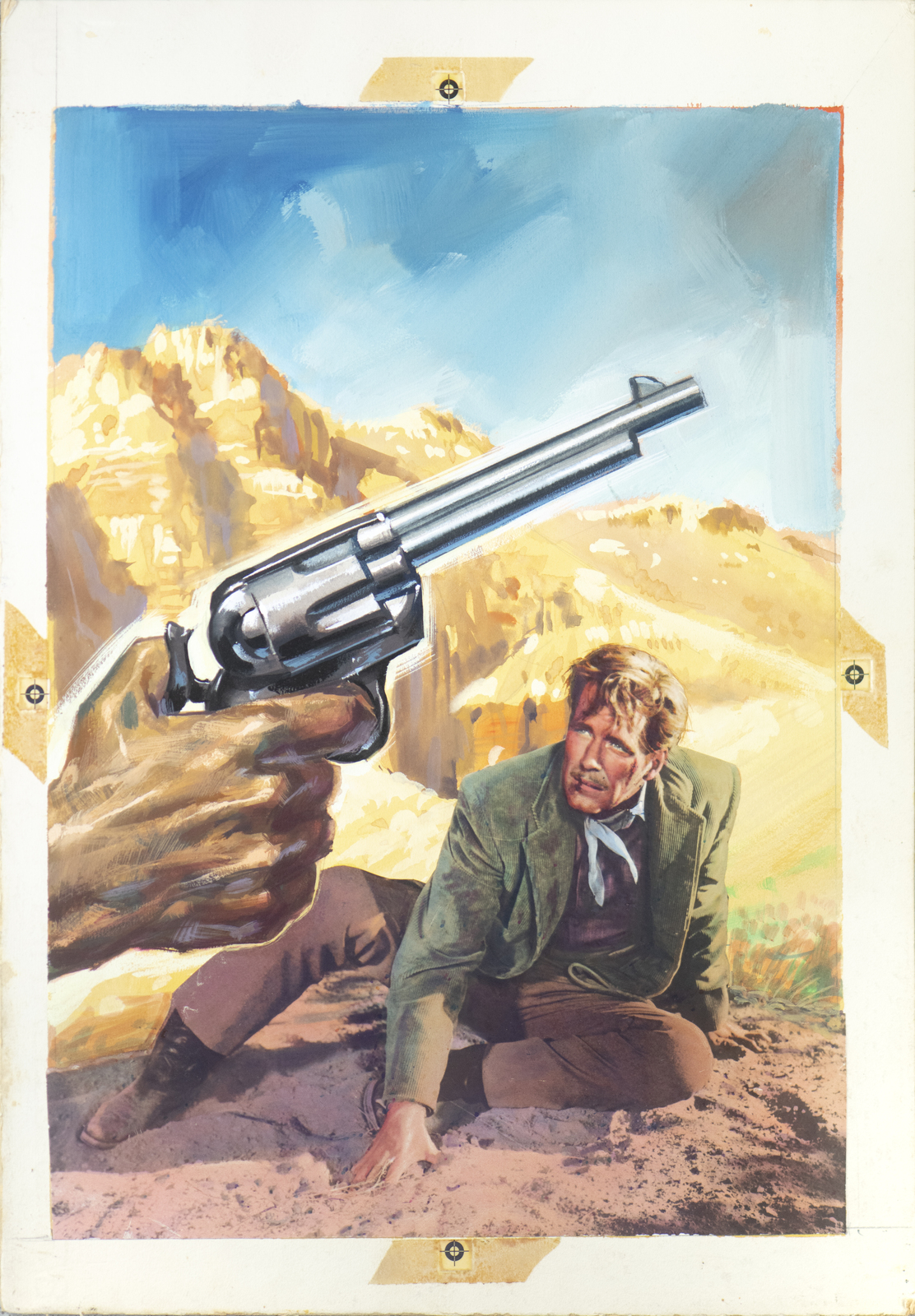 Bozzesi Franco Bozzetto cinematografico per il film "Gun Fury (Il suo onore gridava vendetta)" di Raoul Walsh del 1953. 1960. Tempera, disegno, photographic film/cardboard. Cm 25,00 x 37,00. Per questa selezione di opere straordinarie, su cartone spesso timbrato al retro L’artistica, storico negozio di belle arti di via del Babuino a Roma negli anni 50 e 60. Un rarissimo repertorio di tavole che rappresenta un esperimento visivo e di contaminazione che dura pochi anni, dalla fine degli anni 50 al 1965, quasi esclusivamente pensati per il mercato francese, per riviste come Star Cine Cosmos e Le film du coer e Vaillance come in questo caso specifico. Selezionati e creati da un artista ed editore geniale come Franco Bozzesi, che poi coinvolge anche autoried illustratori come Ermanno Iaia e Franco Fiorenzi nella sua officina quasi sempre autori dei manifesti e di questi stessi cartoni. Collage, raffinata carta fotografica da pellicola ritagliata e sagomata e ritoccata sopra con interventi di pittura a tempera e ulteriore sfumato applicato il tutto su robuste tavole di cartone. Non propriamente cineromanzo, ma una forma innovativa per profondità, prospettiva, invenzioni che riconduce il cinema di quegli anni quasi ad un unico grande melò.