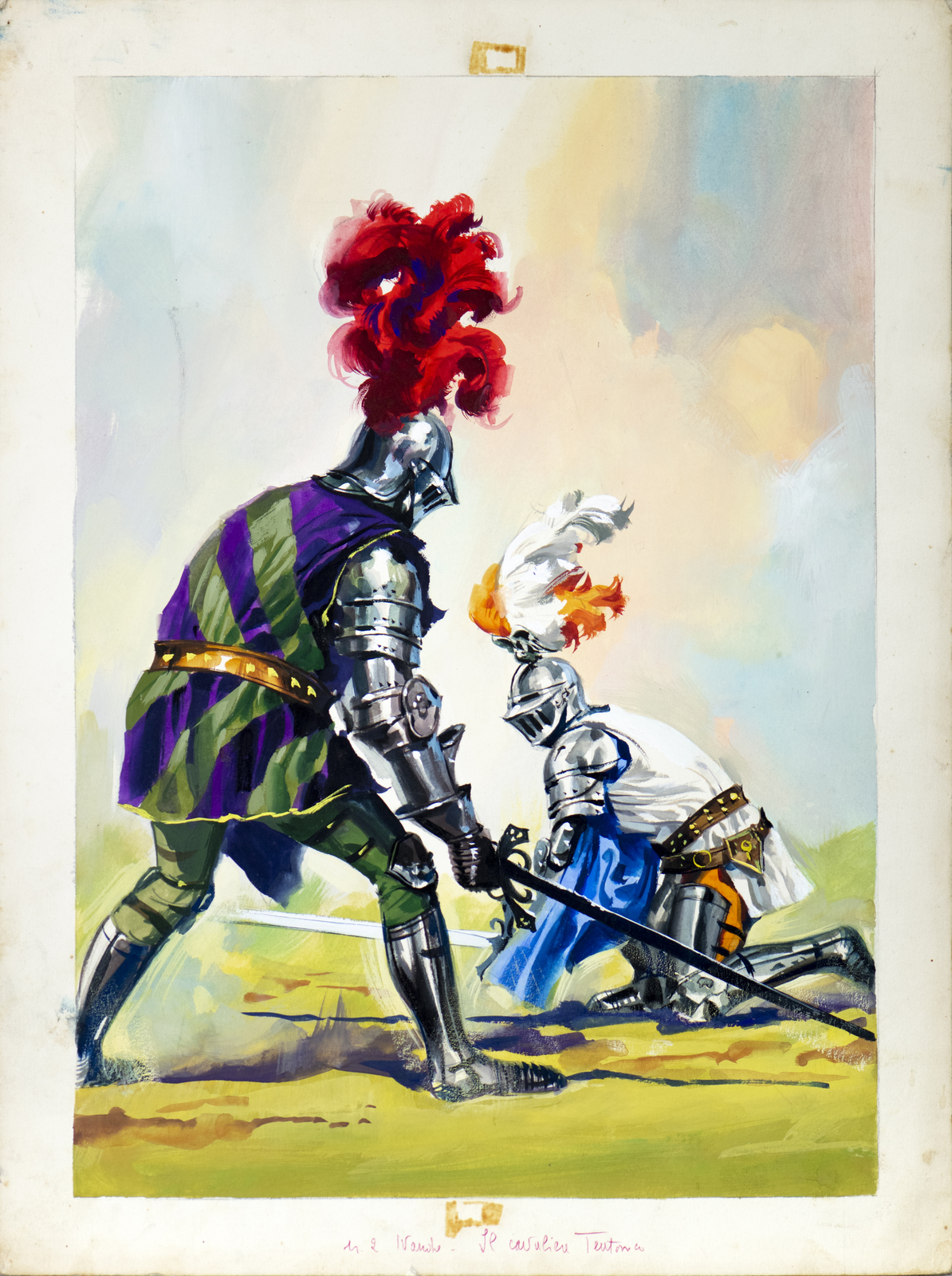 Bozzesi Franco "Bozzetto cinematografico per il film Ivanhoe/Il cavaliere teutonico n 2 (particolare di una scena)". Tempera su cartoncino. Cm 31,00 x 41,00. Ed ora una selezione di opere straordinarie, su cartone spesso timbrato al retro L’artistica, storico negozio di belle arti di via del Babuino a Roma negli anni 50 e 60. Un rarissimo repertorio di tavole che rappresenta un esperimento visivo e di contaminazione che dura pochi anni, dalla fine degli anni 50 al 1965, quasi esclusivamente pensati per il mercato francese, per riviste come Star Cine Cosmos e Le film du coer. Selezionati e creati da un artista ed editore geniale come Franco Bozzesi, che poi coinvolge anche autori come Ermanno Iaia e Franco Fiorenzi nella sua officina. Collage, raffinata carta fotografica da pellicola ritagliata e sagomata e ritoccata sopra con interventi di pittura a tempera e ulteriore sfumato applicato il tutto su robuste tavole di cartone. Non propriamente cineromanzo, ma una forma innovativa per profondità, prospettiva, invenzioni che riconduce il cinema di quegli anni quasi ad un unico grande melò.