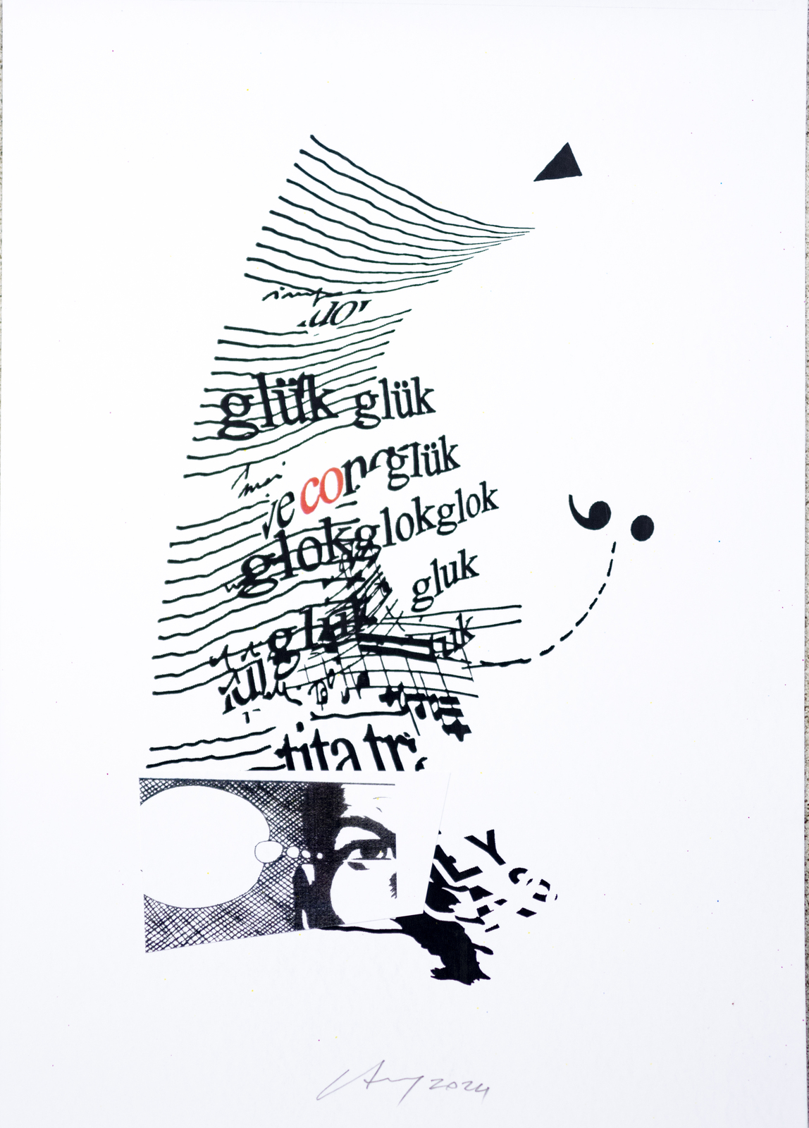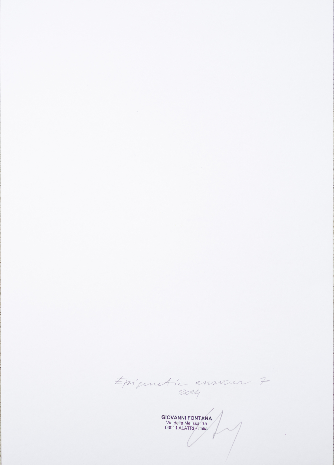 FONTANA GIOVANNI (n. 1946) EPIGENETIC ANSWER 2VISUAL SOUND POEM. 2024. tecnica mista su cartoncino. Cm 21,00 x 31,00. Partiture visive, musica per gli occhi, scritte per essere guardate dove ritrovi sempre il pentagramma, magari nascosto ma lo rivedi. Una dimensione figurale che poi si sposa con la dimensione grafica della scrittura che poi ridiventa suono ed è il suono del fumetto.