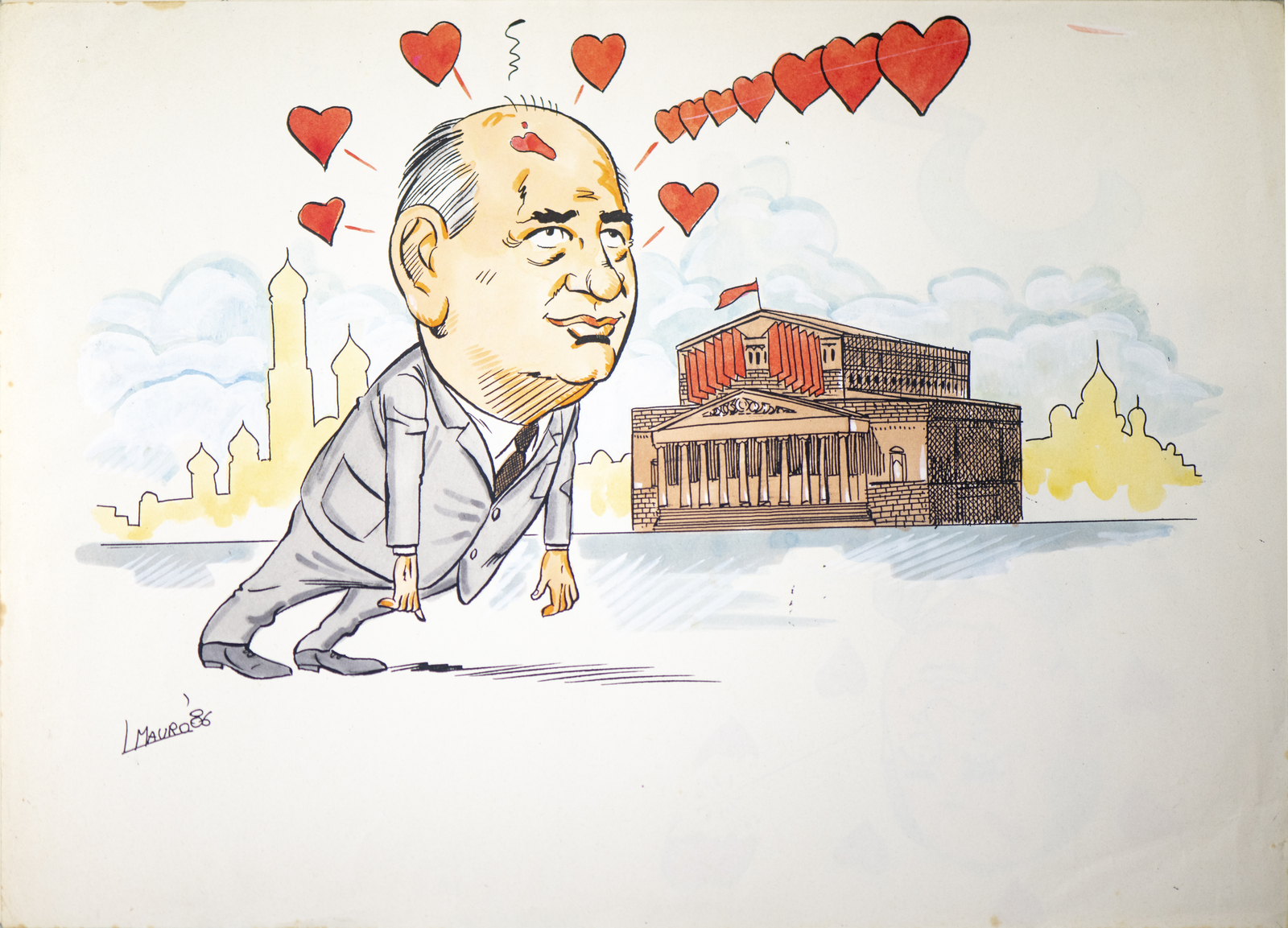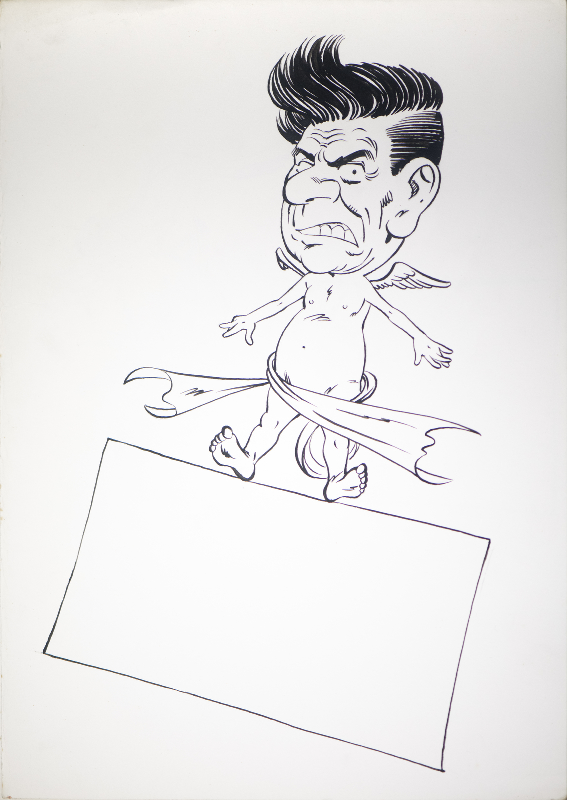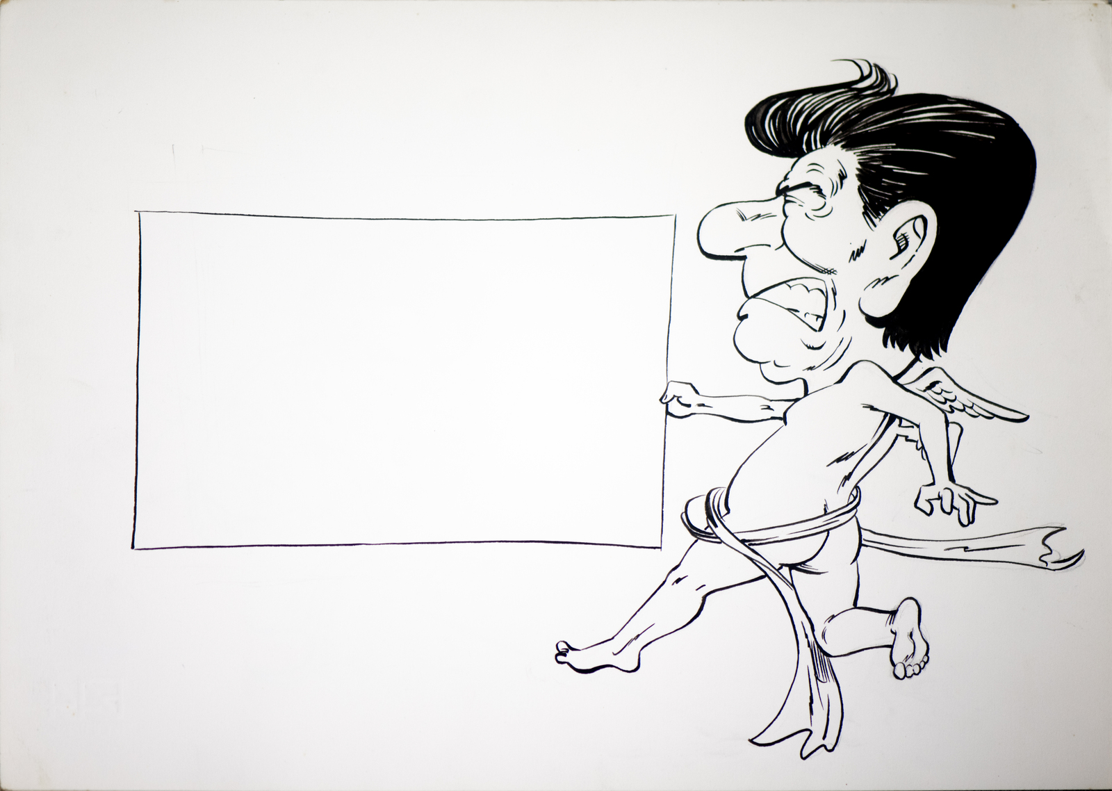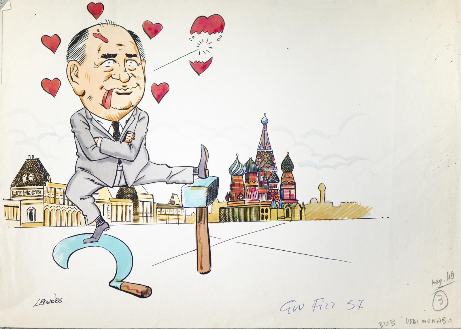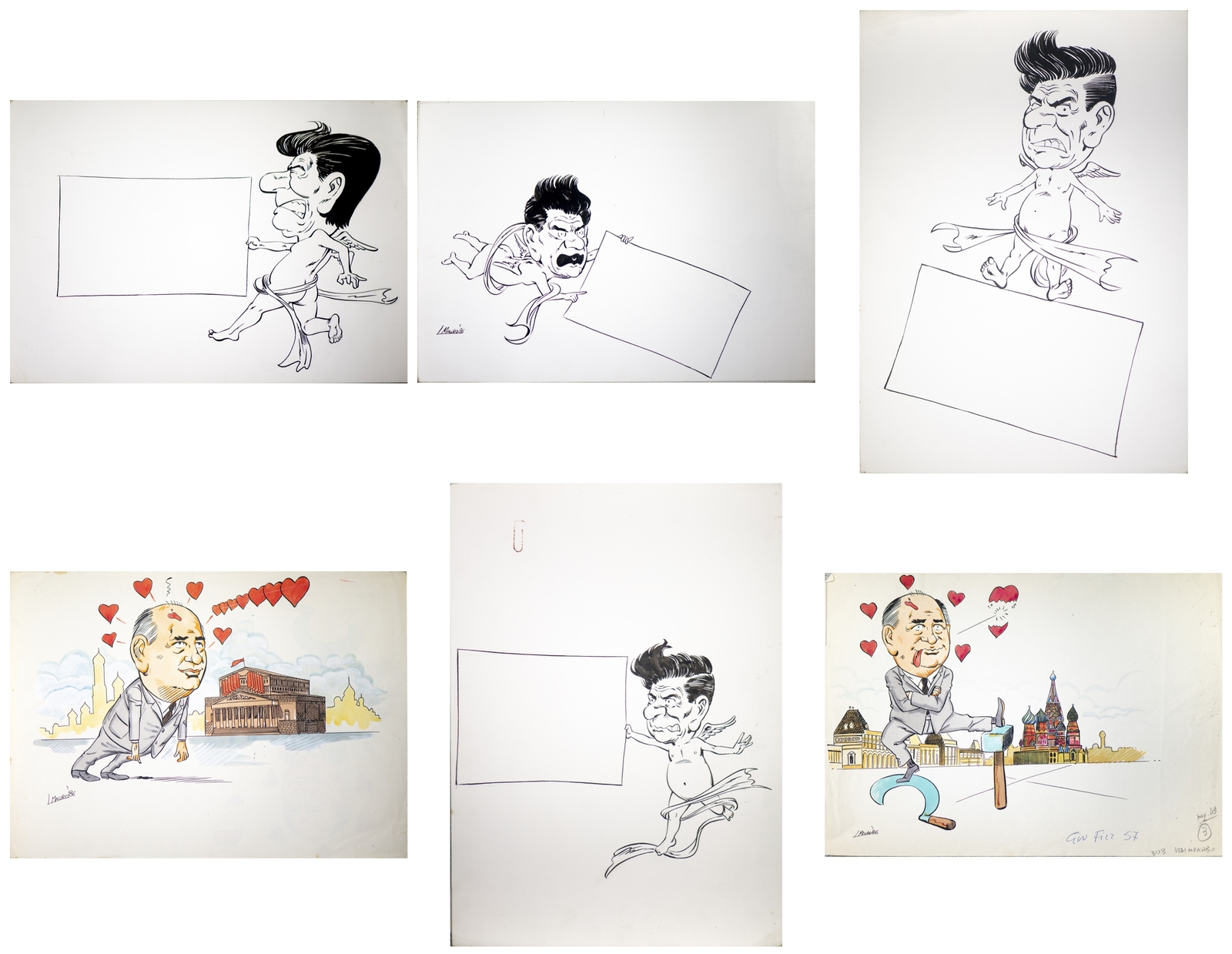 Laurenti Mauro Serie di vignette satiriche. 1986. china e acquarello su cartoncino. Cm 25,00 x 35,00. Una serie di vignette satiriche su Ronald Reagan e Gorbaciov a colori che uscirono su Gin Fiz