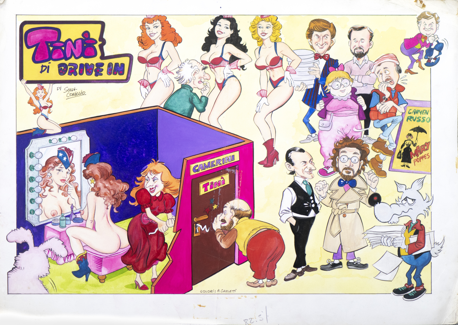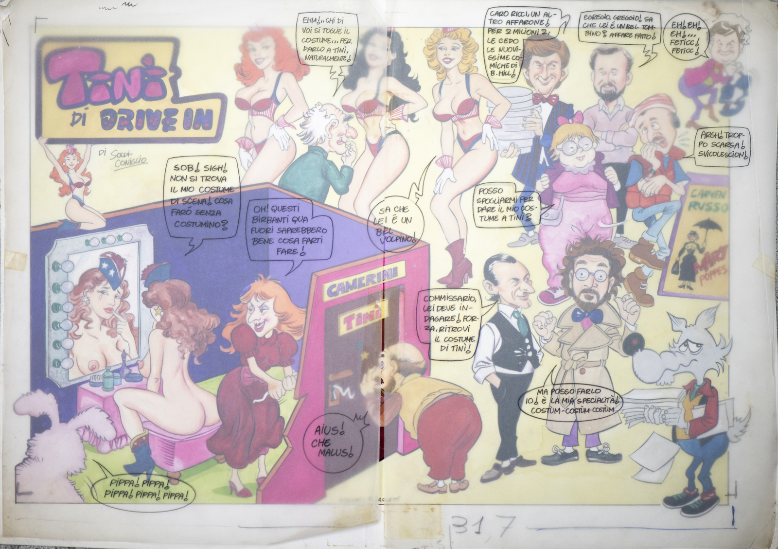 Soldi Marco "Tinì di Drive In". china e acquarello su cartoncino. . Una tavola ispirata al leggendario Drive, un programma televisivo italiano di genere commedia ideato e scritto da Antonio Ricci, trasmesso con cadenza settimanale in prima serata, dal 1983 al 1988 su Italia 1. Il titolo della tavola fa riferimento alla storia della showgirl Tinì Cansino, il cui vero nome è Photina Lappa, nata in Grecia, a Volos. A diciannove anni, durante una vacanza in Italia, viene notata da Alberto Tarallo, produttore di fiction televisive, e all'epoca agente di spettacolo, che la introduce nel mondo della televisione, suggerendole di adottare il nome d'arte di Tinì Cansino, notando una sua somiglianza con la diva americana Rita Hayworth, il cui vero cognome era Cansino. Per molto tempo la stampa e l'opinione pubblica credettero in una sua parentela con l'attrice hollywoodiana.