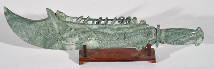 Sciabola in marmo venato verde, completa di base in legno lunghezza cm 52