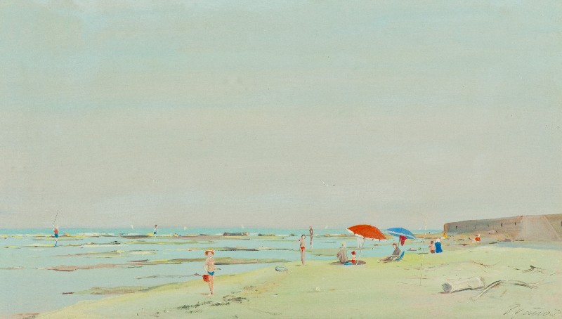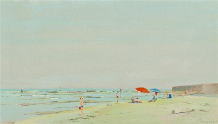 Piero Vaccari (Livorno 1926 - 1997) MARINA CON FIGURE Olio su tela, cm. 40x70 Firmato in basso a destra. Sul verso: firma.
