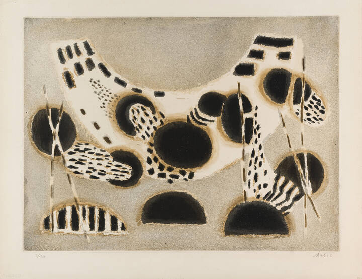Opera firmata in basso a destra e numerata in basso a sinistra (a matita sul foglio); intitolata e iscritta "MUSIC" a matita al retro