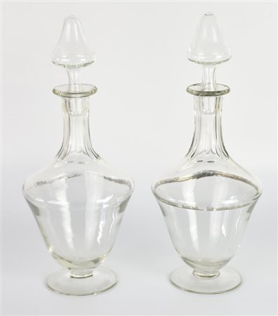 COPPIA DI BOTTIGLIE IN VETRO CON DECORI IN ARGENTO Vetro, forma a campana...