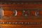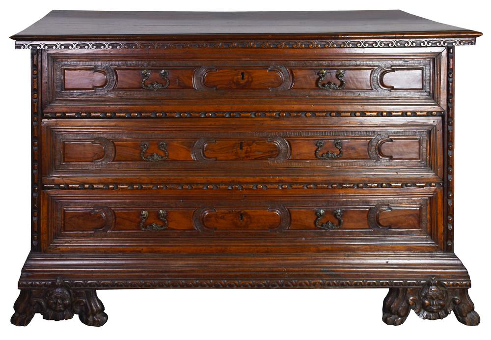 legno massello di noce, intagliato con cassetti a formelle mistilinee e supporti scolpiti con motivo riproposto nelle