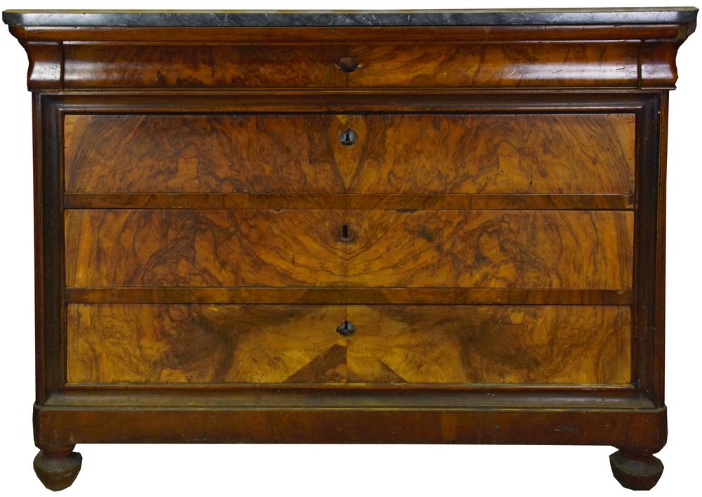 legno di noce e radica di noce, struttura a quattro cassetti di cui il più piccolo posto nella fascia a gola di tulipano, piedi torniti, pianale in marmo