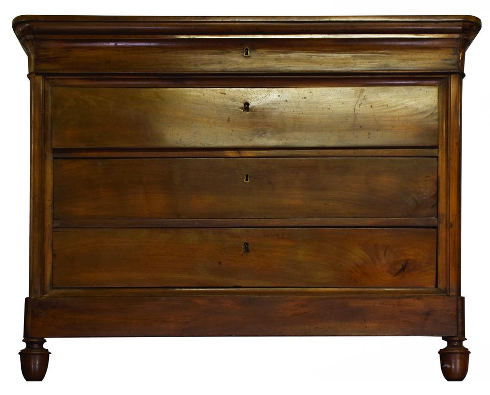 legno di noce, struttura a quattro cassetti, di cui il primo più piccolo in corrispondenza della fascia a gola di tulipano, piedi ad anfora