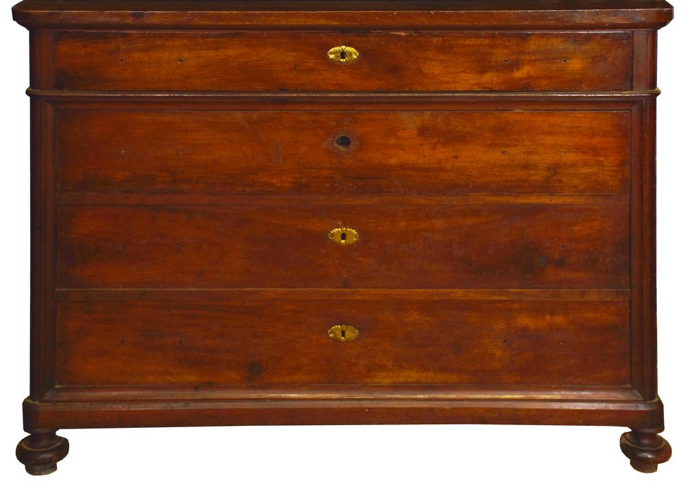 legno massello di noce, struttura a quattro cassetti, pianale in noce, piedi torniti