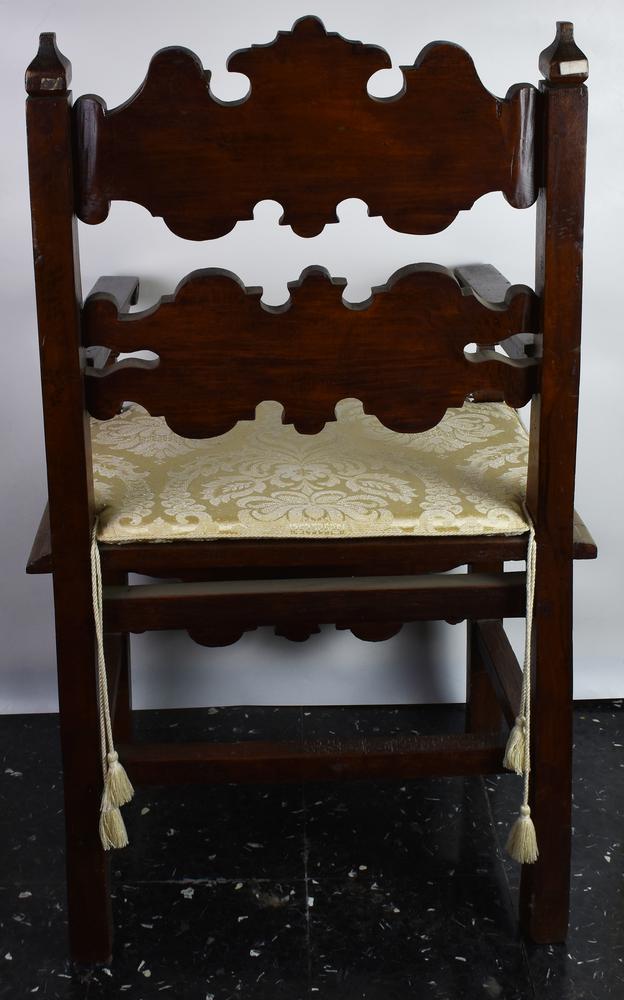 SEDIA CON BRACCIOLI, Lombardia prima metà del XVII secolo legno massello di noce, struttura con schienale intagliato a giorno, gambe dritte raccordate da traverse sagomate