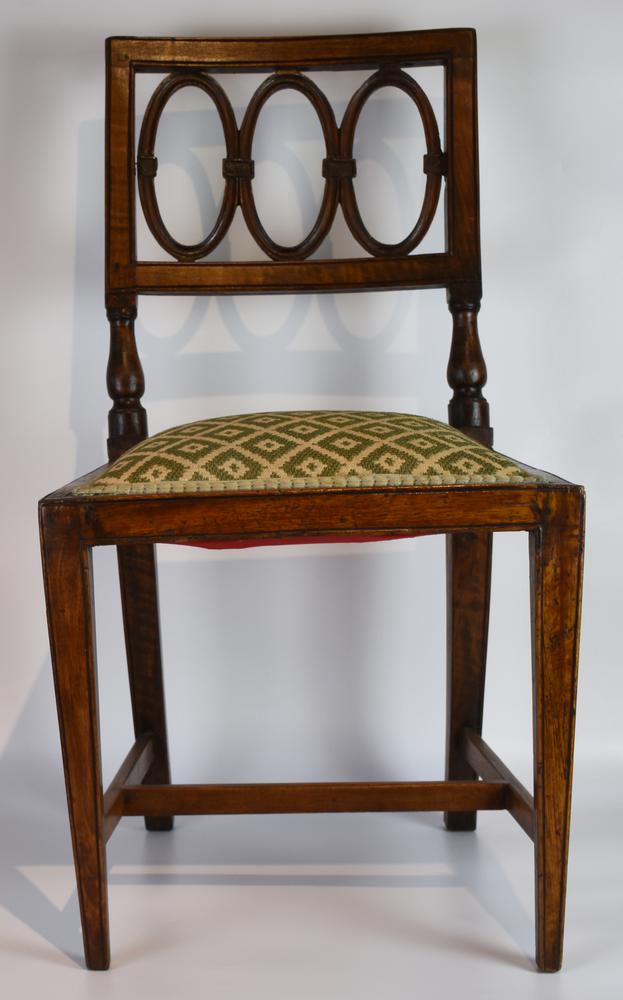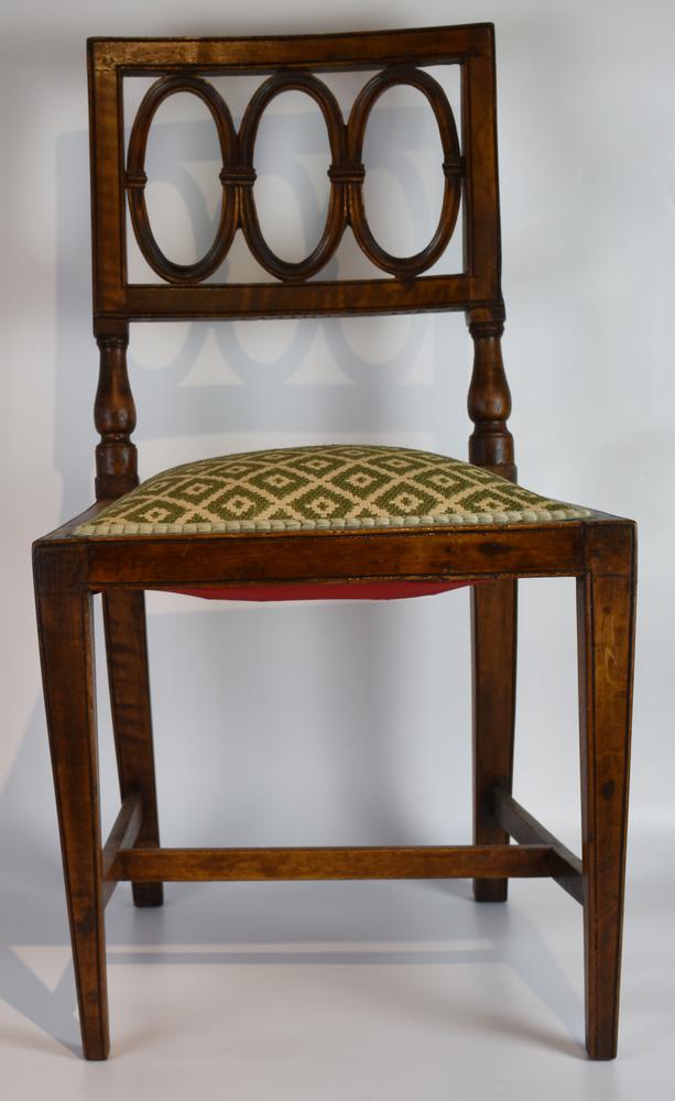legno di noce struttura con gambe a faretra, schienale a giorno lavorato, seduta rivestita in stoffa